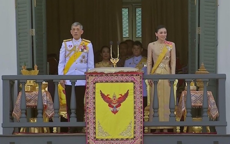 ล่าง : พระบาทสมเด็จพระปรเมนทรรามาธิบดีศรีสินทรมหาวชิราลงกรณ พระวชิรเกล้าเจ้าอยู่หัว รัชกาลปัจจุบัน พร้อมด้วยสมเด็จพระนางเจ้าสุทิดา พัชรสุธาพิมลลักษณ พระบรมราชินี เสด็จออก ณ สีหบัญชร พระที่นั่งสุทไธสวรรย์ปราสาท หมู่พระที่นั่งในสวนศิวาลัย ในพระบรมมหาราชวัง พระราชทานพระบรมราชวโรกาสให้ประชาชนชาวไทยเฝ้าทูลละอองธุลีพระบาทถวายพระพรชัยมงคล เนื่องในการพระราชพิธีบรมราชาภิเษก พุทธศักราช 2562 เมื่อวันที่ 6 พฤษภาคม พุทธศักราช 2562