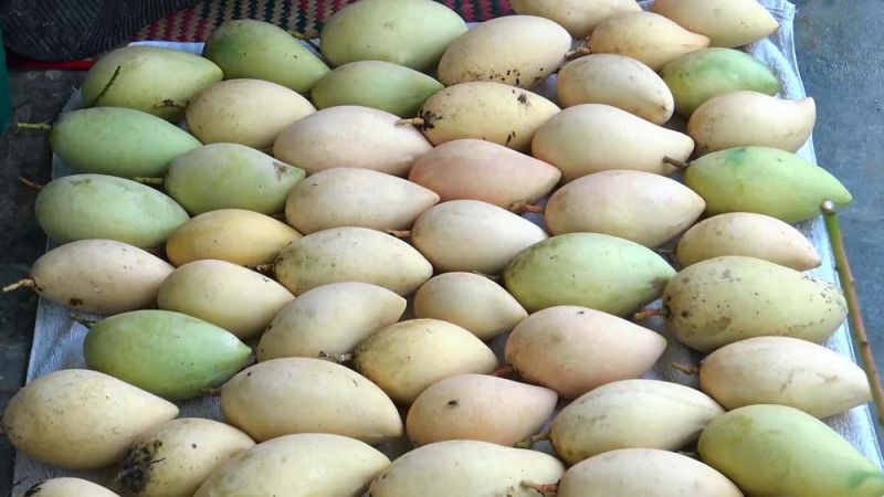 สวนมะม่วงน้ำดอกไม้ เฉลิมชัย ปลูกมะม่วงน้ำดอกไม้สีทอง ในพื้นที่ 11 ไร่ 350 ต้น ซึ่งเป็นมะม่วงน้ำดอกไม้เกรด A ทั้งหมด โดยปลูกมาแล้ว 9 ปี ในช่วงนี้เป็นช่วงที่มะม่วงน้ำดอกไม้สีทองรุ่นแรกล๊อตแรก สุกพร้อมเก็บ เนื่องจากต้นมะม่วงทุกต้นมีความสมบูรณ์และสภาพอากาศร้อนมะม่วงสุกเร็วก่อนกำหนด