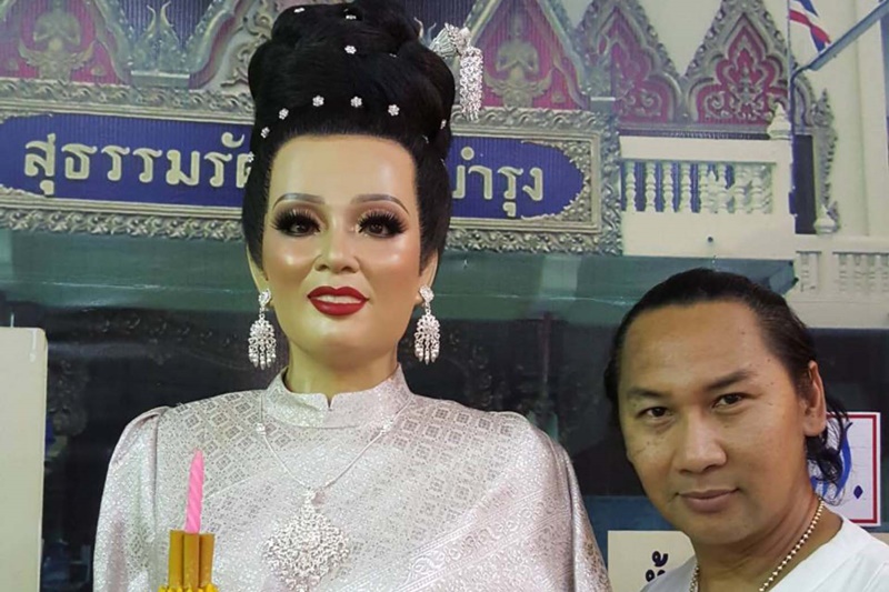 ล่าสุดวันนี้ (6 มิ.ย.) "เจ้เมย์ เพชรา วงศ์เทวัญ" แต่งหน้าชื่อดังในวงการสาวประเภทสอง พร้อมทีมงาน "ป้าเทิด ป้าแดง ป้าหนิง น้องพัตตี้ น้องอ้อ" ได้นำเสื้อผ้า ชุดไทยบรมพิมาน สีปูนแห้ง เครื่องสำอาง และเครื่องประดับต่างๆ มาเปลี่ยนให้ใหม่กับหุ่นที่ 7 พุ่มพวง ดวงจันทร์ นานกว่า 3 ชั่วโมง จนสวยสดงดงามราวกับเหมือนว่ามีชีวิตจริง ภายในศาลาการเปรียญสุธรรมรัตราษฎร์บำรุง จุดที่ตั้งอัฐิของราชินีเพลงลูกทุ่ง ซึ่งมีผู้คนต่างเข้ามากราบไหว้กันอย่างต่อเนื่อง