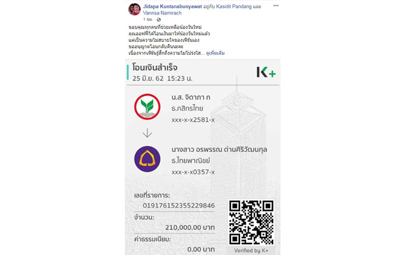 ล่าสุด...เจ้าตัวได้โพสต์สลิปการโอนเงินระหว่างคุณแม่น้องวันใหม่กับออฟฟี่ โดยมีข้อความระบุว่า “เขาได้โอนเงินมาให้แม่น้องวันใหม่นะคะ จำนวนเงิน 210,000 บาท แต่แม่น้องไม่ขอรับตั้งแต่แรกแล้ว เพราะว่าเงินซื้อทุกอย่างไม่ได้ แม่น้องโอนเงินคืนทั้งหมดให้แล้วนะคะ ดูได้จากสลิป?