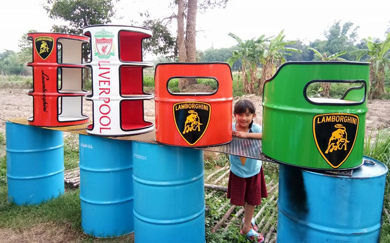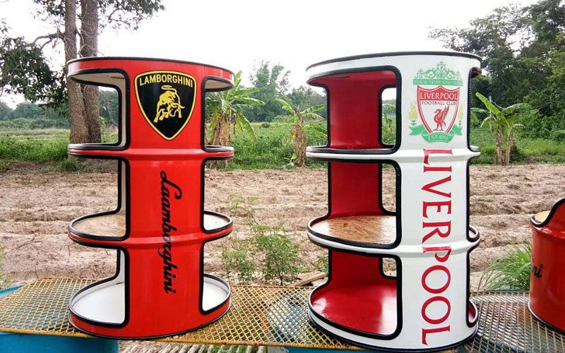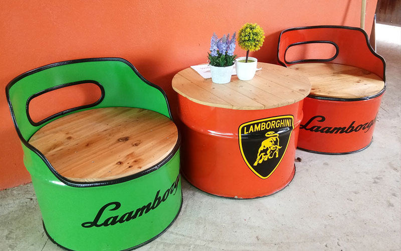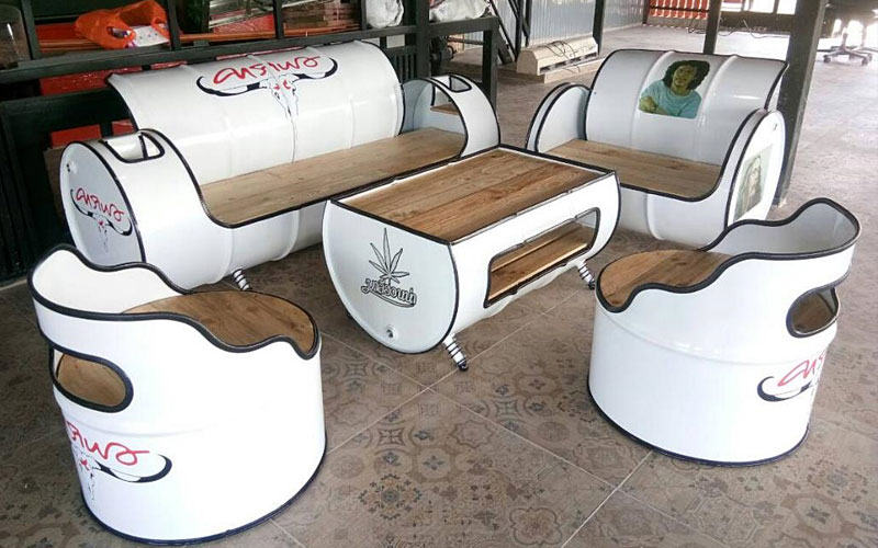 นายภูมิพัฒน์ กล่าวต่อว่า สำหรับการทำเฟอร์นิเจอร์นั้นเริ่มต้นจากตนมีบ้านสวนอยู่ท้ายหมู่บ้าน และบ่อยครั้งมักจะมีเพื่อนๆญาติพี่น้องแวะมาเยี่ยมเป็นประจำ แต่ที่บ้านไม่มีเก้าอี้ให้เพื่อนๆที่มาได้นั่งกัน จนต้องนำถังพลาสติกมาเป็นเก้าอี้แทน ตนจึงคิดที่จะทำเก้าอี้ขึ้นเองจากเถาวัลย์ จากนั้นก็เกิดไอเดียใหม่ขึ้นจึงลองนำถังน้ำมันมาทำเก้าอี้ดู และลองดัดแปลงจากถังน้ำมันและถังน้ำยาที่ทำการเกษตรที่มีอยู่ในบ้านมาทำดูก่อน และลองศึกษาหาข้อมูลต่างๆจากโซเชียล จากยูทูปต่างประเทศ เพื่อนำมาเป็นแนวทางและทดลองทำจนเกิดความชำนาญ