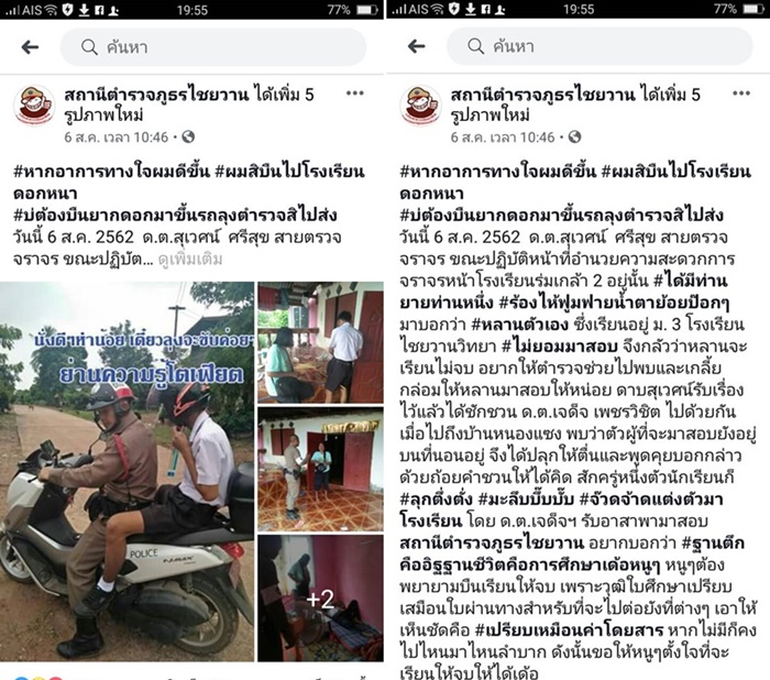 ผู้สื่อข่าวรายงานความคืบหน้ากรณีเพจของสถานีตำรวจภูธรไชยวาน อ.ไชยวาน จ.อุดรธานี ได้โพสต์เรื่องราวเหตุการณ์ตำรวจ 2 นายเข้าไปเกลี้ยกล่อมเด็กชายคนหนึ่งอายุ 15 ปี ซึ่งเป็นนักเรียนชั้นประถมศึกษาปีที่ 3 ที่นอนซมอยู่ในห้องนอนมานาน 3 อาทิตย์ เนื่องจากไม่อยากไปเข้าสอบ พร้อมข้อความระบุว่า "หากอาการทางใจผมดีขึ้น ผมสิบืนไปโรงเรียนดอกหนา บ่ต้องบืนยากดอกมาขึ้นรถลุงตำรวจสิไปส่ง"