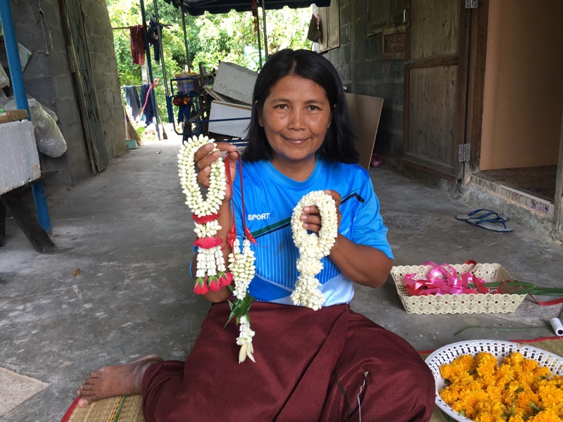 "ที่ลูกค้าชอบพวงมาลัยดอกมะลิของเรา ก็เพราะเป็นมะลิสด และเราจะคัดเฉพาะดอกสวยๆ ตูมๆ มาร้อยเท่านั้นเพื่อให้ดูสวยงาม ร้อยตามแบบถนัดที่เราเห็นตามท้องตลาดทั่วไปไม่ได้มีแบบที่ยากมากนัก ขายทุกวันที่ปั๊ม ปตท.และตลาดเขียว อ.สังขะ แต่ละวันก็จะมีรายได้ 300-500 บาท ส่วนเทศกาลก็จะได้มากหน่อย 2.000-3.000 บาท โดยส่วนใหญ่ถ้าเทศกาลลูกค้าจะโทรมาสั่งจองมากกว่า พวงละ 20 - 50 - 100 บาท"