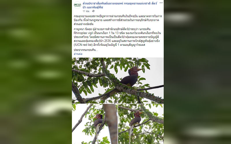 28 กันยายน 2562 เพจเฟซบุ๊คที่มีชื่อว่า “ส่วนประชาสัมพันธ์และเผยแพร่ กรมอุทยานแห่งชาติ สัตว์ป่า และพันธุ์พืช” ได้ระบุข้อความว่า...กรมอุทยานเผยสภาพปัญหาการล่านกชนหินในปัจจุบัน และมาตรการในการป้องกัน ทั้งด้านกฎหมาย และสร้างการมีส่วนร่วมในการอนุรักษ์กับทุกภาคส่วนอย่างเข้มข้น