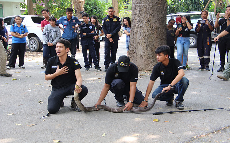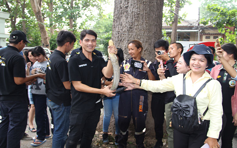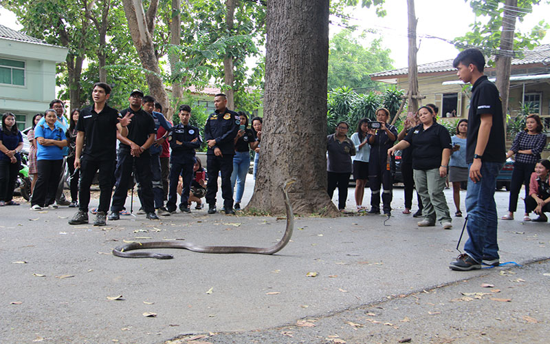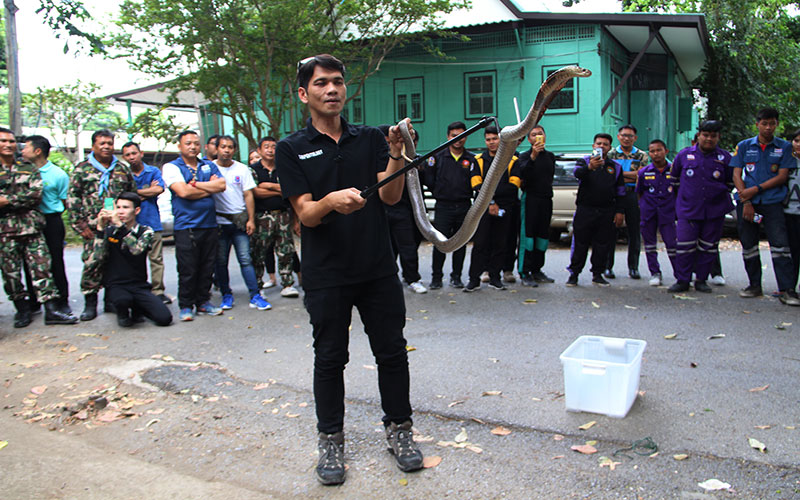 ช่วงการสาธิต หลายคนก่อยังตื่นกลัว หวาดเสียว เมื่องูจงอาง งูเห่า ขนาดใหญ่ยกตัวแผ่แม่เบี้ยสูงเกือบเอว บางคนกล้า ๆ กลัว ๆ โดยนายนิรุทธ์ ชมงาม วิทยากรสาธิต การจับหัวงูจงอางที่เป็นสัตว์ดุร้าย มีลำตัวใหญ่ยาวเกือบ 4 เมตร ให้ผู้เข้าอบรมได้สัมผัส เผื่องูเข้าบ้านจะไปปฏิบัติได้ถูกวิธีและปลอดภัยทั้งคนและสัตว์