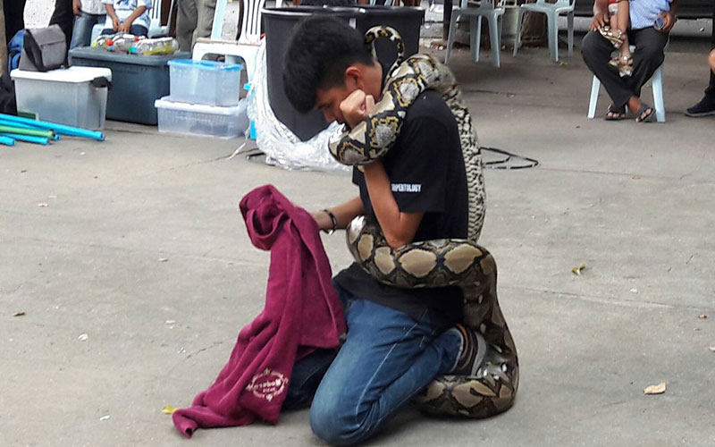 นายนิรุทธ์ ชมงาม อายุ 37 ปี นักธรรมชาติวิทยา วิทยากรสาธิตการจับงู เปิดเผยวิธีการจับงูที่ปลอดภัยว่า ฝึกจับงูมาตั้งแต่เด็กเกือบ 30 ปี การจับงูนั้นไม่ยากแต่ต้องเข้าใจพฤติกรรมของงูและกระทำด้วยความไม่ประมาทถือเป็นสิ่งสำคัญ บางครั้งการจับงูบ่อยๆ จนเกิดความเคยชิน อาจทำให้เราประมาท