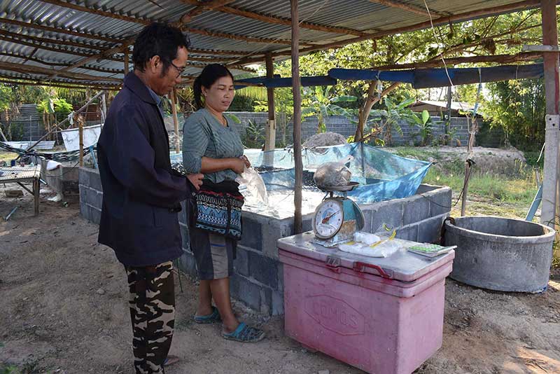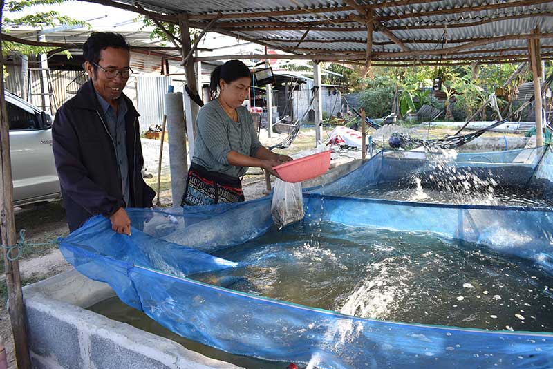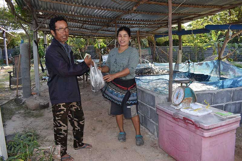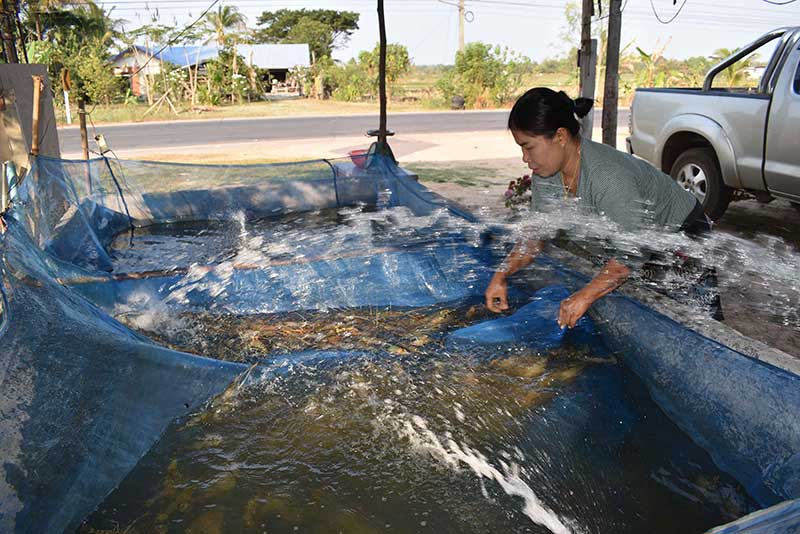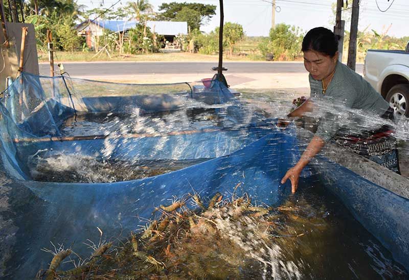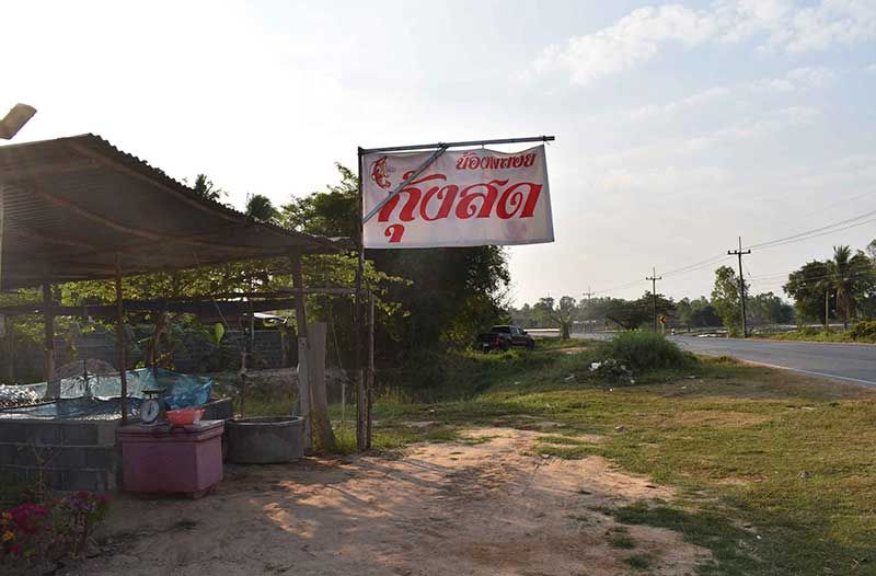 โดยนางธนภัทร บุญธรรม อายุ 44 ปี บ้านเลขที่ 16 หมู่ 17 บ้านดอนอุดม ต.บัวบาน อ.ยางตลาด จ.กาฬสินธุ์ ได้ใช้จังหวะในช่วงวันหยุดปีใหม่นี้ เปิดร้านขายกุ้งสดหน้าบ้านของตนเอง โดยทำเพิงหน้าบ้านและก่อซีเมนต์เพื่อเป็นบ่อพักกุ้ง ได้กำไรวันละ 3,000 บาท