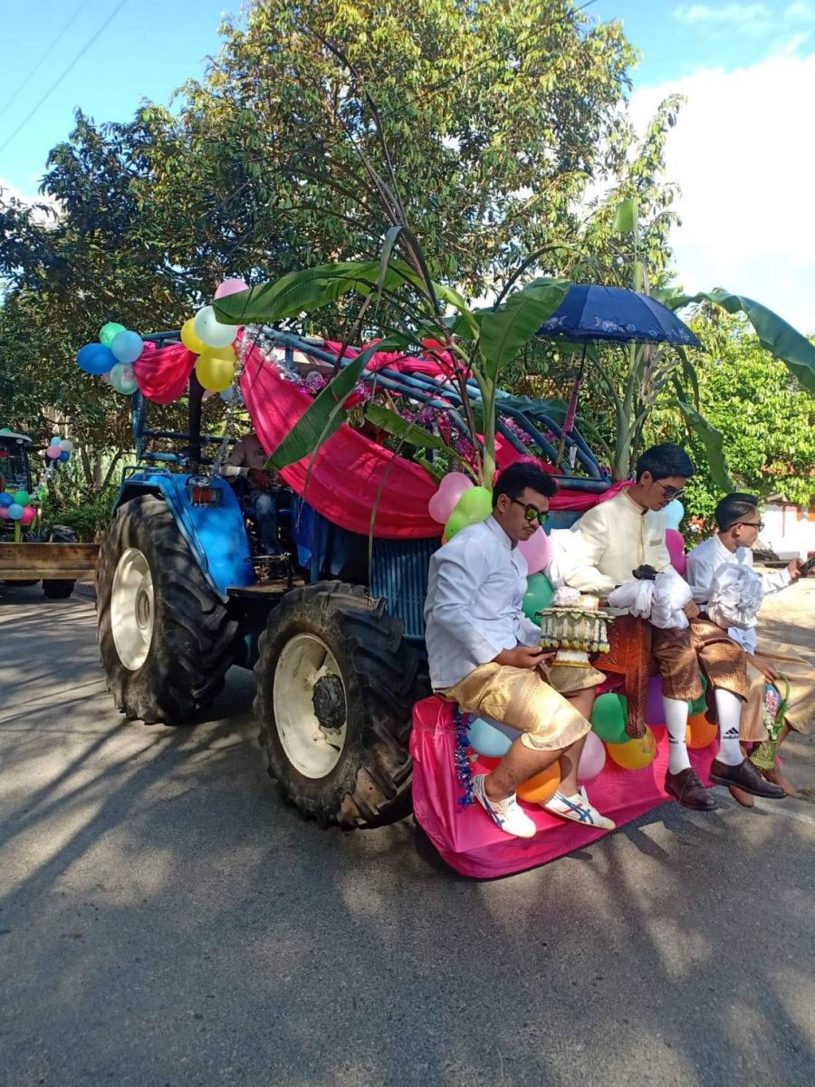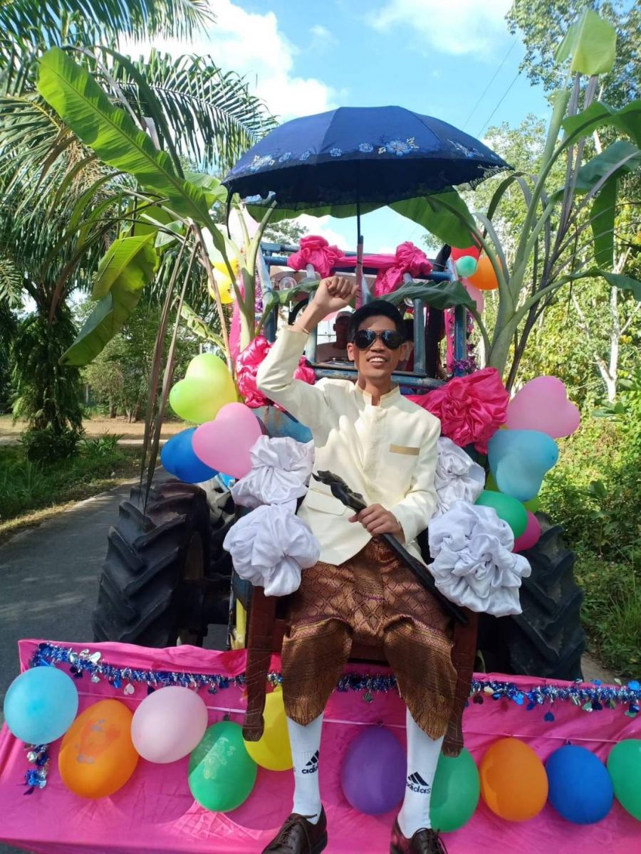 รวมทั้งแขกเหรื่อที่มาร่วมแสดงความยินดี เนื่องจากนายศรายุทธ เจ้าบ่าว ญาติๆ และเพื่อนเจ้าบ่าว มีการนำรถไถจำนวน 3 คัน มาประดับตกแต่งด้วยผ้าแพรหลากสี ดอกไม้ ลูกโป่งที่สีสันสดใส รวมทั้งประดับเก้าอี้ให้เจ้าบ่าวนั่ง และเพื่อนเจ้าบ่าวที่ถือหัวขันหมากนั่งบริเวณหัวตักรถไถ เคลื่อนขบวนออกจากบ้านเจ้าบ่าวมุ่งหน้าไปสู่ขอ น.ส.ธิดารัตน์ เจ้าสาว ที่บ้านเลขที่ 54/3 หมู่ 4 บ้านควนนกหิน ต.ท่ายาง อ.ทุ่งใหญ่ อย่างไรก็ตามหน้าขบวนขันหมากรถไถของเจ้าบ่าว มีการนำรถกระบะที่ตกแต่งด้วยเครื่องเสียงพร้อมเปิดเพลงเพื่อสร้างความบันเทิง