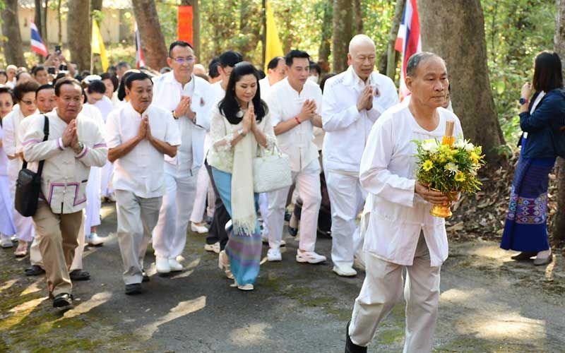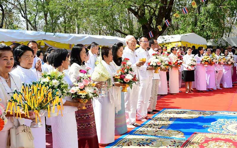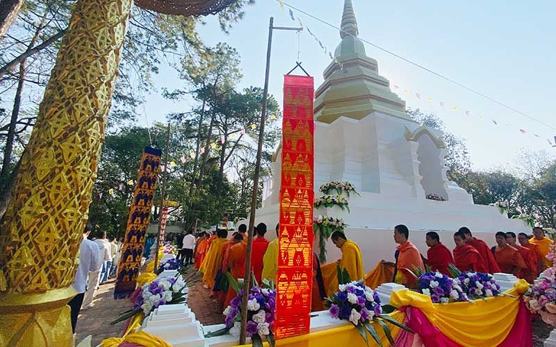 พร้อมกันนี้ได้นำผ้าห่มพระธาตุ สีเหลืองทอง ความยาว 99 เมตร วนโดยรอบพระธาตุ 3 รอบและประกอบพิธีเวียนเทียนองค์พระธาตุ เนื่องในสัปดาห์วันมาฆบูชา และถวายข้าวตอกดอกไม้ไว้ยังบนพระธาตุ