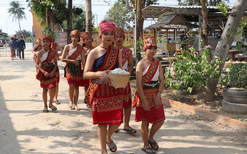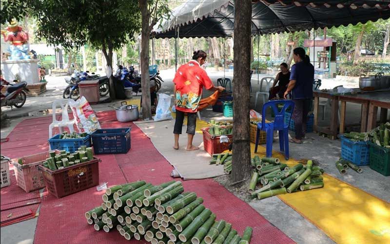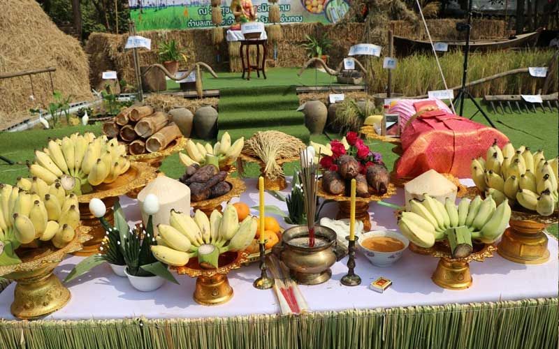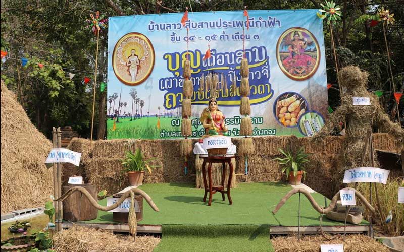 ชาว 'บ้านลาว' อำเภอไชโย จังหวัดอ่างทอง จัดงานประเพณี 'กำฟ้า บุญเดือนสาม เผาข้าวหลาม ปิ้งข้าวจี่' ถวายบัตรพลีเทวดา ณ วัดศุขเกษมธรรมิการาม ไม่พลาดส่องขันน้ำมนต์หาตัวเลขไปเสี่ยงดวง