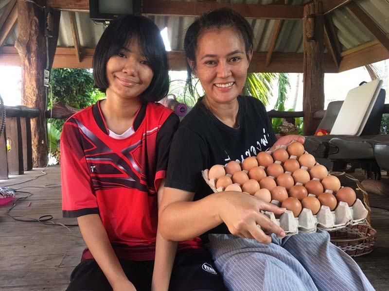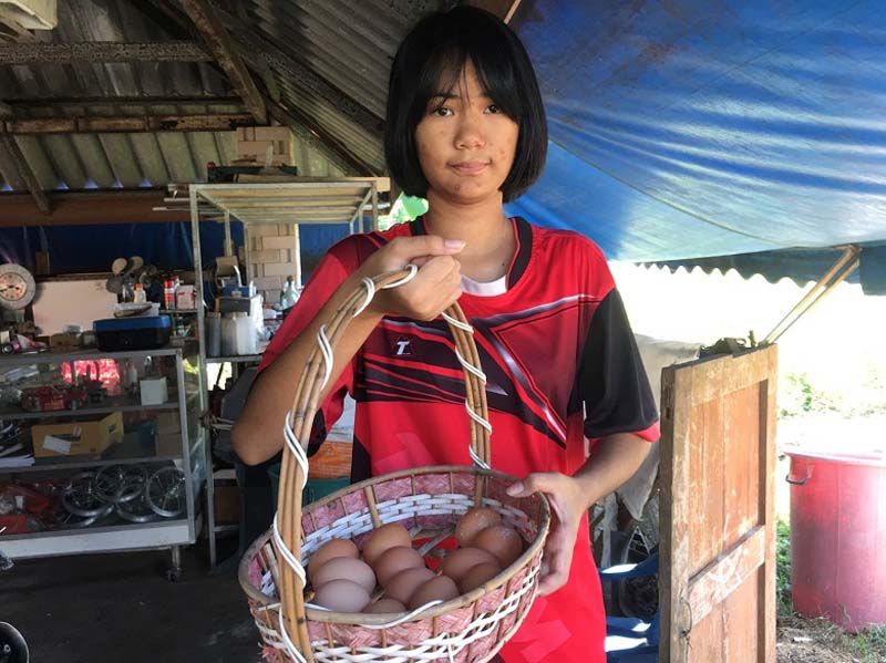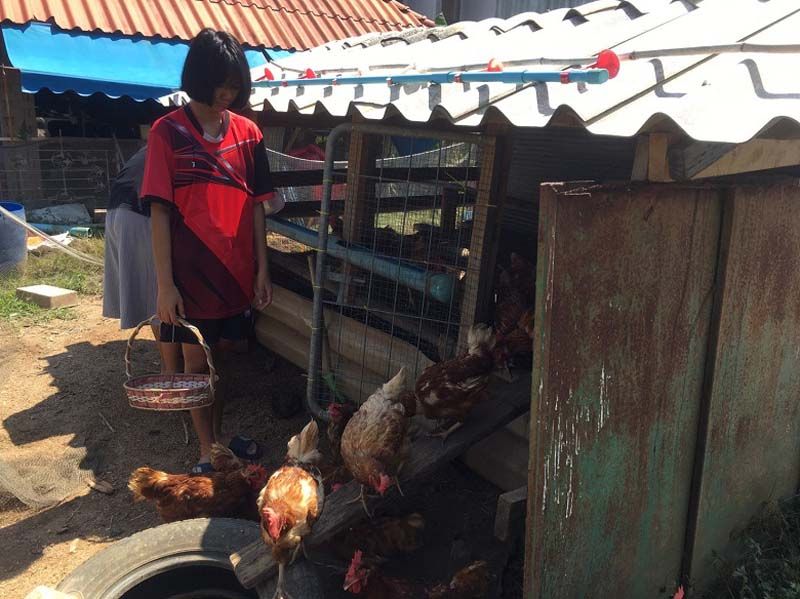 น้องน้ำฟ้า บุตรสาววัย 13 ปี บอกว่า จะช่วยพ่อแม่ให้อาหารยามพ่อแม่ไม่อยู่ และช่วยเก็บไข่ในเล้าสนุกดี ไข่ที่เหลือจากทำกินที่บ้าน ก็จะแบ่งปันเพื่อนบ้านเพื่อขาย โดยไก่ไข่ได้วันละ 15-20 ลูก ซึ่งมีไก่ 32 ตัว