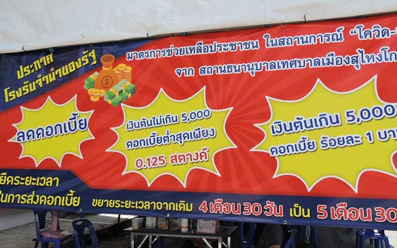 ส่วนมาตรการช่วยเหลือบรรเทาความเดือดร้อน ทางสำนักงานคณะกรรมการจัดการสถานธนานุบาลเมืองสุไหงโก-ลก ออกมาตรการช่วยเหลือประชาชน โดยให้ผ่อนผันหรือยืดระยะเวลาชำระหนี้แก่ผู้จำนำในห้วงเดือน ก.พ.3-มิ.ย.63 ให้ขยายเวลาไถ่ถอนไปอีก 1 เดือน นับจากครบกำหนด พร้อมกับปรับลดอัตราดอกเบี้ยให้กับผู้ที่นำทรัพย์สินมาจำนำระหว่าง 1 เม.ย.- 30 มิ.ย.63 ขณะที่เทศบาลตำบลป่าแดด เตรียมเพิ่มเงินอีก 25 ล้านบาท รวมของเดิมเป็น 50 ล้านบาทเพื่อเป็นเงินทุนหมุนเวียนช่วยเหลือประชาชนผู้นำทรัพย์สินมาจำนำในช่วงนี้