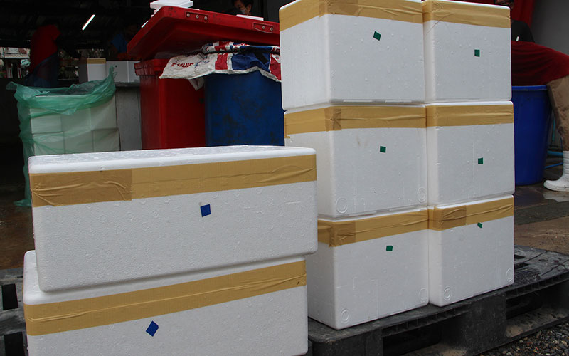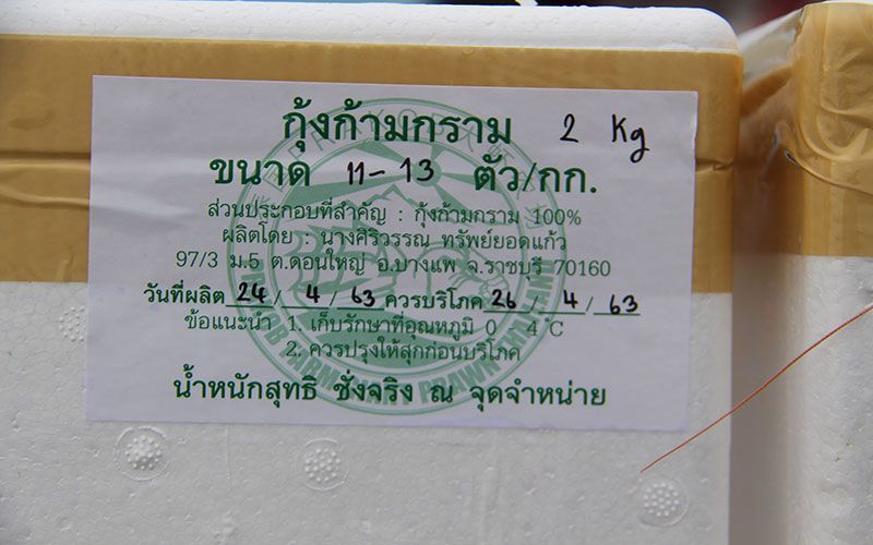 สำหรับขนาดไซส์กุ้งก้ามกรามเพศผู้ล้วนส่งขายทางระบบออนไลน์ได้แก่ เบอร์ 1 ขนาด 8-10 ตัว/โล ราคากก.ละ 370 บาท เบอร์ 2 ขนาด 11-13 ตัว/โล ราคากก.ละ 330 บาท เบอร์ 3 ขนาด 14-15 ตัว /โล ราคา กก.ละ 280 บาท การบรรจุจะมีเทคนิคเพื่อรักษาคุณภาพ คือให้นำน้ำแข็งป่นและเกลือโรยไปในด้านล่างก่อน แล้วนำกุ้งแต่ละไซส์วางเรียงเป็นแถวจะมีกล่องขนาด 2 -10 กก. จะมีสติ๊กเกอร์สีและชื่อผู้รับและผู้นำส่งติดไว้ด้านข้าง เพื่อความชัดเจนกรณีส่งถึงมือลูกค้าถูกต้อง จากนั้นให้นำน้ำแข็งโรยให้เต็มแล้วจึงโรยเกลือด้านบนอีกครั้ง จากนั้นจึงปิดฝาให้สนิทแล้วจับเขย่าให้เกลือและน้ำแข็งเข้าด้วยกัน เพื่อทำให้กุ้งคงความสดอยู่ได้นานถึงมือลูกค้าเป็นของดีมีคุณภาพ