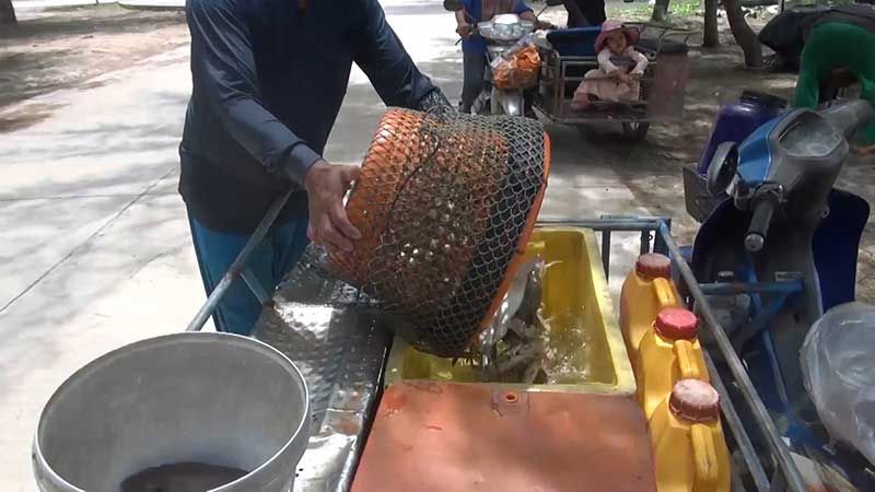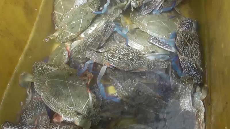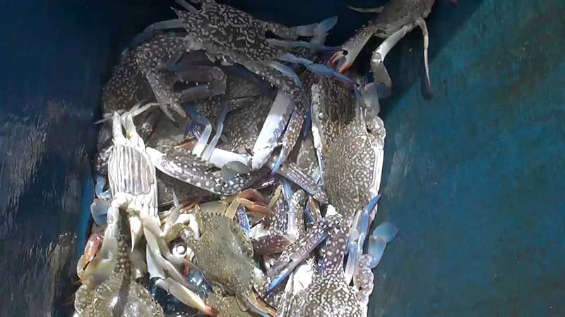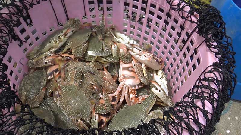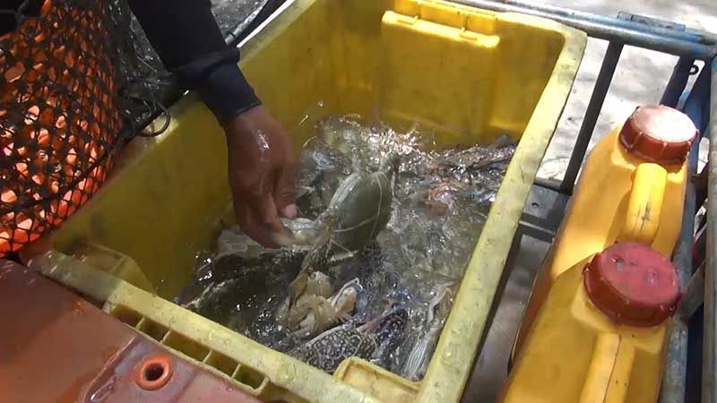 นายดลเหล๊าะหมาน หมัดเส็น วัย 45 ปี ชาวประมงอวนปูชุมชนบ้านบ่ออิฐ ต.เกาะแต้ว อ.เมือง จ.สงขลา บอกว่า วันนี้ได้นำเรือออกไปวางอวนปูม้า ตั้งแต่ประมาณตีสาม โดยวิ่งเรือออกไปประมาณเกือบชั่วโมงจากฝั่ง ระยะทางประมาณ 5- 6 กิโลเมตร เพื่อไปวางอวนปู หลังจากนั้นก็จะกลับเข้าฝั่งในช่วงเช้า วันนี้ได้ปูม้าประมาณ 5 – 6 กิโลกรัม ทั้งตัวใหญ่และตัวเล็ก ทั้งตัวผู้ตัวเมีย โดยทำการแกะปูม้าออกจากอวนบนเรือ และใส่ในท้องเรือที่ใส่น้ำเตรียมไว้เพื่อไม่ให้ปูตาย เมื่อถึงฝั่งก็นำไปใส่ถุงตาข่ายไปแช่น้ำในทะเล เพื่อให้ปูอยู่ในน้ำและยังมีชีวิต เพราะปูม้าจะต้องขายปูเป็นๆ จึงจะได้ราคาดี