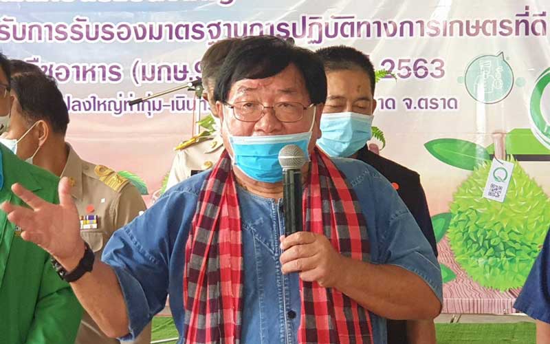 นายประภัตร กล่าวว่า ทั้งนี้ สำนักงานมาตรฐานสินค้าเกษตรและอาหารแห่งชาติ (มกอช.) ได้ดำเนินโครงการพัฒนาศักยภาพเกษตรกรผู้ปลูกทุเรียนในพื้นที่เกษตรแปลงใหญ่ภาคตะวันออกให้ได้รับการรับรองมาตรฐานการปฏิบัติทางการเกษตรที่ดี (GAP) สำหรับพืชอาหาร (มกษ.9001-2556) ปี 2563 เพื่อพัฒนาให้เกษตรกรผู้ปลูกทุเรียนจังหวัดตราด มีความรู้ความเข้าใจในหลักการปลูกทุเรียนให้ได้ตามมาตรฐาน GAP สามารถผลิตทุเรียนได้มีคุณภาพ มีความปลอดภัย ตรงตามความต้องการของตลาด และผู้บริโภค รวมถึงสามารถขายผลผลิตทุเรียนผ่านระบบตลาดสินค้าเกษตรออนไลน์ DGTFarm.com ห้างโมเดิร์นเทรด และโรงงานผลิตทุเรียนแช่เยือกแข็งเพื่อการส่งออกตามมาตรฐานบังคับ เรื่อง การปฏิบัติที่ดีสำหรับการผลิตทุเรียนแช่เยือกแข็ง (มกษ. 9046-2560)