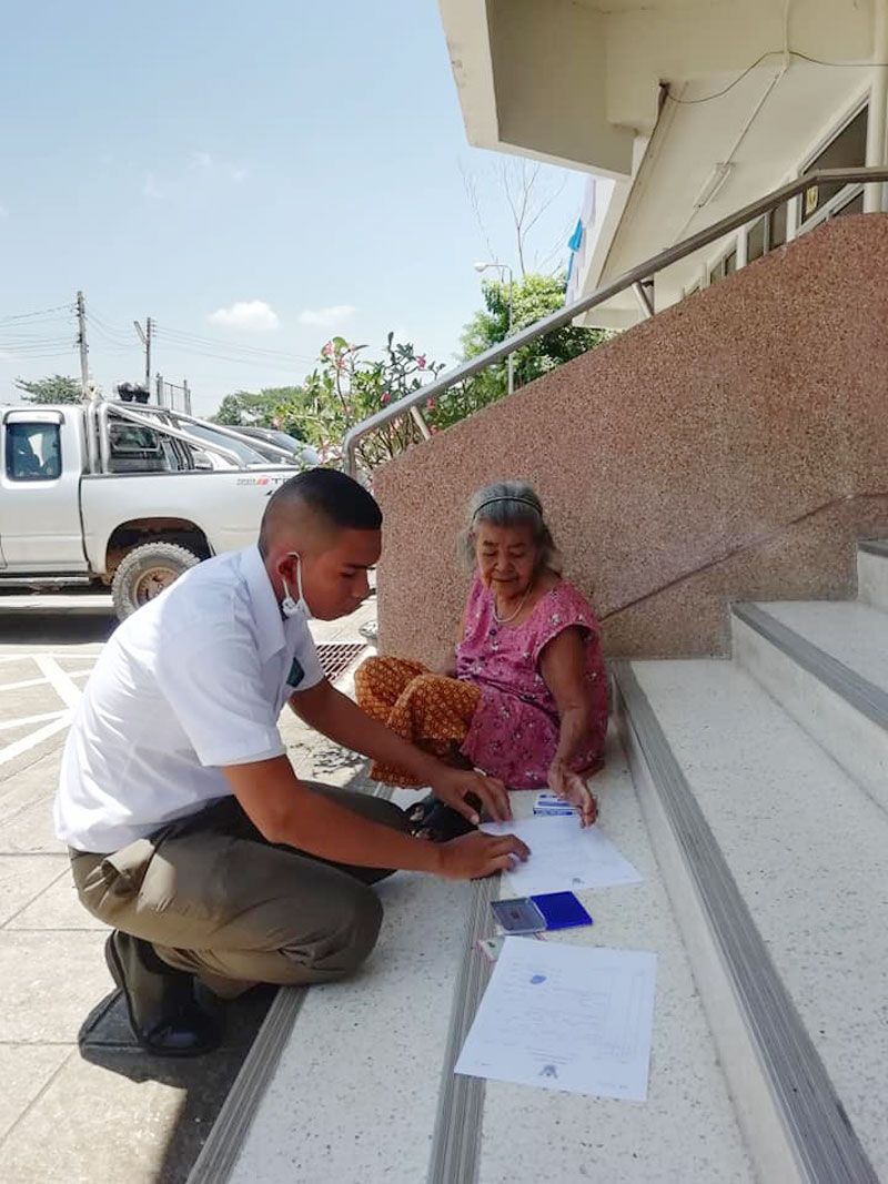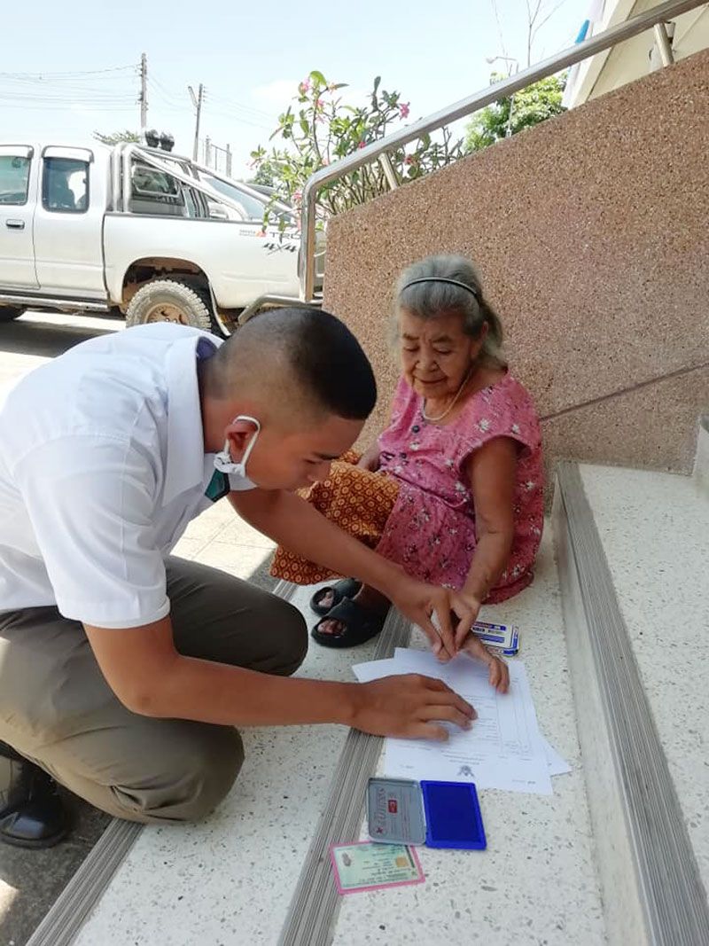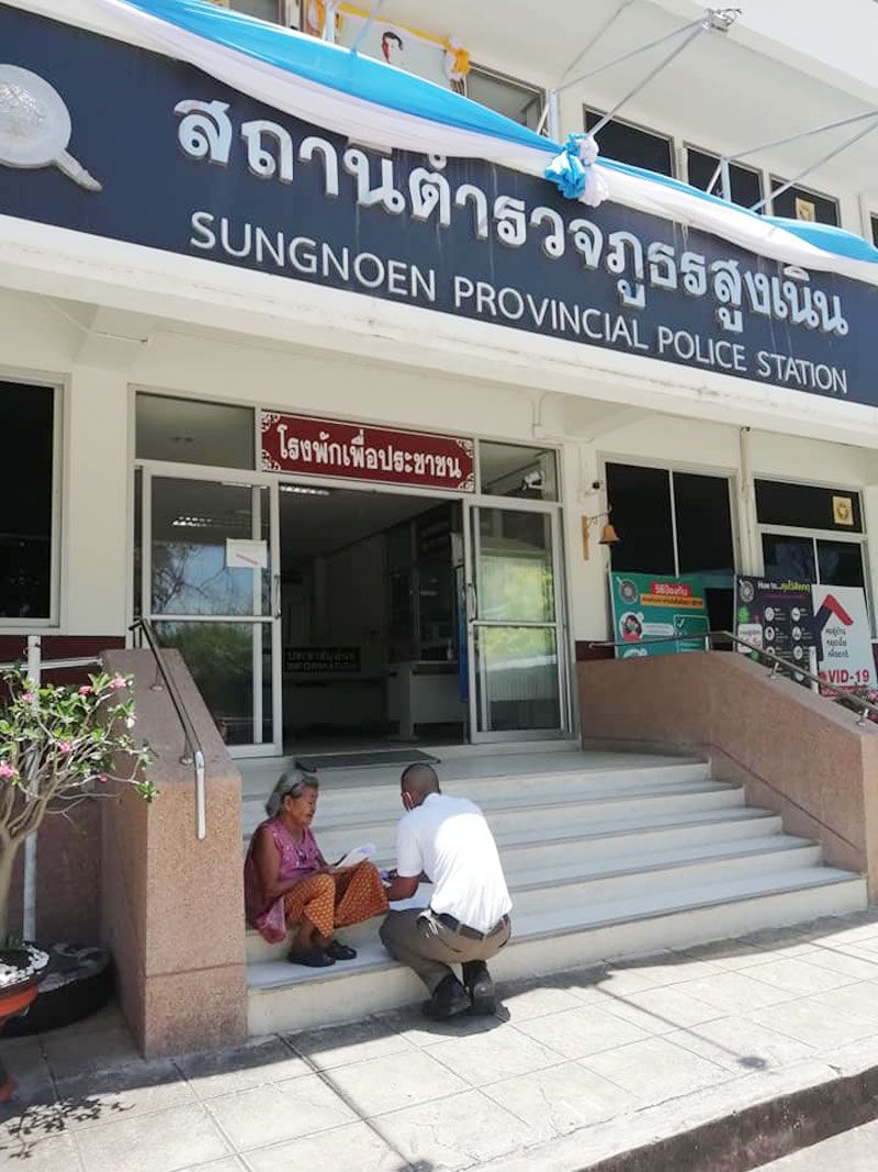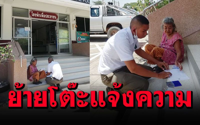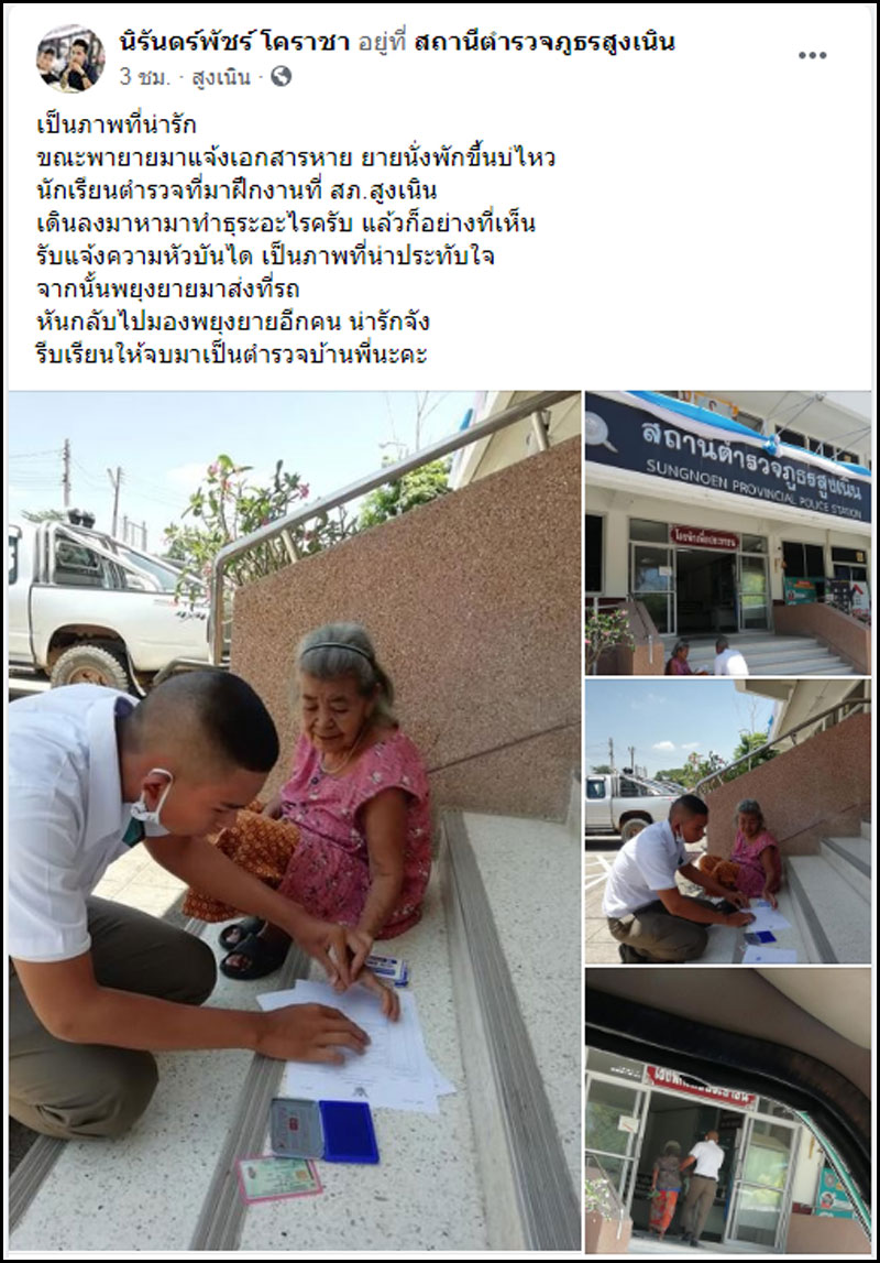 " ขณะพายายมาแจ้งเอกสารหาย ยายนั่งพักขึ้นบ่ไหว นักเรียนตำรวจที่มาฝึกงานที่ สภ.สูงเนิน เดินลงมาหามาทำธุระอะไรครับ แล้วก็อย่างที่เห็น รับแจ้งความหัวบันได เป็นภาพที่น่าประทับใจ