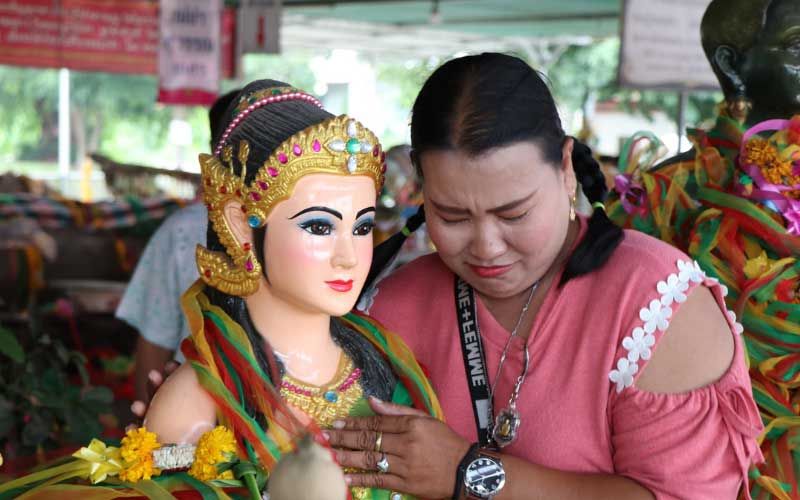 วันที่ 9 ตุลาคม 2563 ผู้สื่อข่าวรายงาน ที่วัดใหม่โคกมะรุม ตำบลม่วงเตี้ย อำเภอวิเศษชัยชาญ จังหวัดอ่างทอง พบหญิงสาวอายุประมาณ 30ปี รูปร่างท่วม สวมเสื้อยืดสีชมพู นุ่งกลางเกงยีนส์ขา3ส่วน เดินทางมากราบไหว้ขอโชคลาภแม่ตะเคียน ขณะที่ผูกผ้าสามสีบูชารูปปั้นแม่ตะเคียน จู่ๆก็เกิดแปลกได้ทำการกอดรูปปั้นแม่ตะเคียน พูดเป็นเสียงคล้ายเด็กน้อย ว่าน่ารักแล้วอยากพากลับบ้านจังเลย และบอกคิดถึงบ้านน้ำตาไหล คล้ายมีเด็กน้อยเข้าแฝงร่าง เพียงครู่เดียว ก่อนหายเป็นปกติ แล้วเดินไปเสี่ยงทายล้วงไหเสี่ยงโชคจับได้เลข 219 เพื่อนำไปเสี่ยงดวงต่อไป