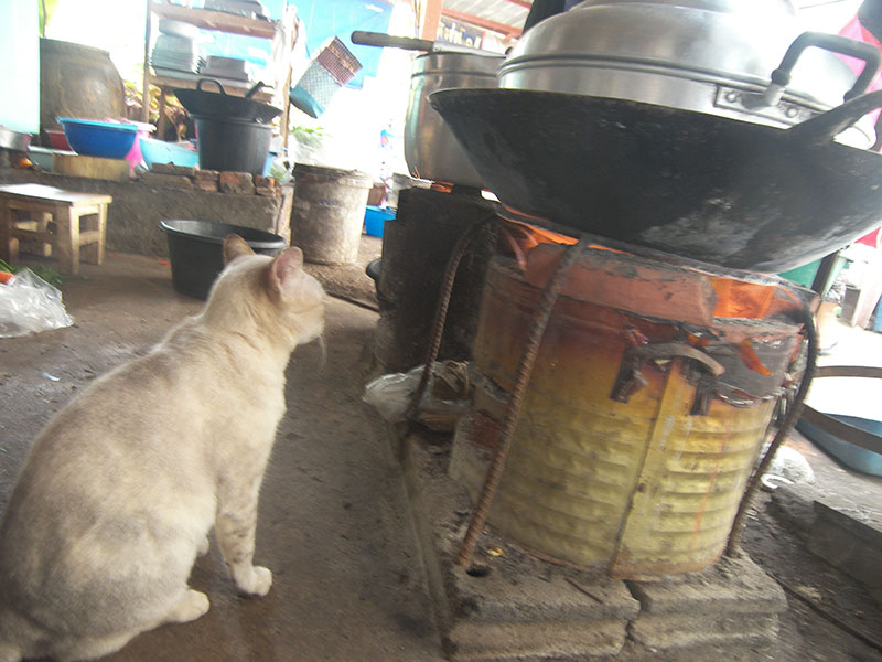 โดยเฉพาะช่วงนี้ อากาศหนาวกระแสลมพัดรุนแรง มาหลายวันแล้ว ประกอบท้องฟ้ามืดไม่มีแสงแดด ขณะทำกับข้าว อาหาร ไปขายที่ตลาดโต้รุ่ง เจ้าหน้าขาว จะเดินมานั่งผิงไฟที่หน้าเตาถ่าน โดยนั่งหันหน้าเข้าเตาไฟ บางครั้งจะนอนหันด้านข้างใกล้เตาไฟ เรียกว่าเปลี่ยนกิริยาบท ถ้ามีแสงแดดจะเดินไปผิงแดด ที่บริเวณหน้าบ้านเพื่อคลายหนาว