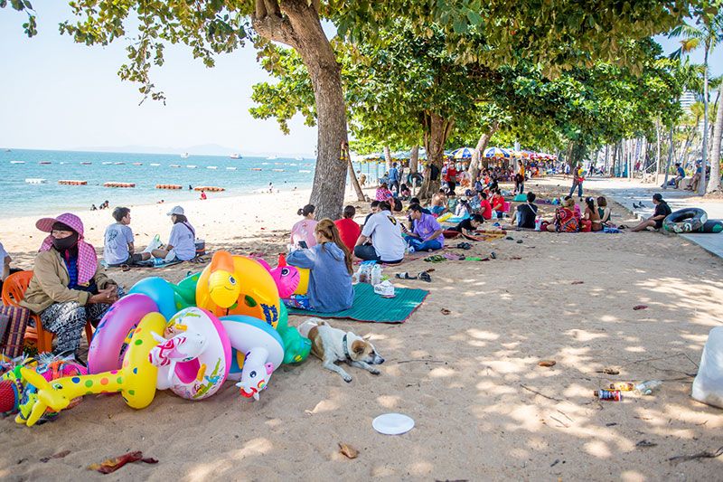 นอกจากนี้ยังมีนักท่องเที่ยวส่วนใหญ่ที่เดินทางมาชายหาดจอมเทียน ส่วนใหญ่นำเสื่อมาปูใต้ร่มไม้ใหญ่ และนำสิ่งของที่เตรียมมานั่งรับประทานกันเป็นครอบครัว แต่ก็มีนักท่องเที่ยวบางส่วนที่ใช้บริการร่มเตียงชายหาดจอมเทียน ส่วนการจราจรบริเวณชายหาดจอมเทียนก็เต็มไปด้วยรถยนต์ของนักท่องเที่ยวที่เดินทางมาท่องเที่ยวในช่วงวันหยุด