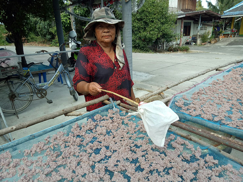 โดยขั้นตอนจะใช้ตัวเคย 7 กิโลกรัม ต่อเกลืออย่างดี 1 กิโลกรัม คลุกเคล้าให้เข้ากันหมักไว้นาน 1 คืน จากนั้นนำออกผึ่งแดดพอหมาดให้พอดี จากนั้นจึงเอามาใส่โครกไม้ตำให้แหลกก็จะได้เนื้อกะปิชั้นดี บดอัดด้วยมือบรรจุใส่กระปุกวางจำหน่ายในชุมชน โดยเฉพาะช่วงนี้เป็นช่วงใกล้ปีใหม่ ซึ่งหลายคนที่เดินทางมาประกอบอาชีพในชุมชน ต่างก็จองเพื่อนำกลับไปเป็นของฝากภูมิลำเนาเดิม เป็นอาชีพสำหรับครัวเรือนท้องถิ่น