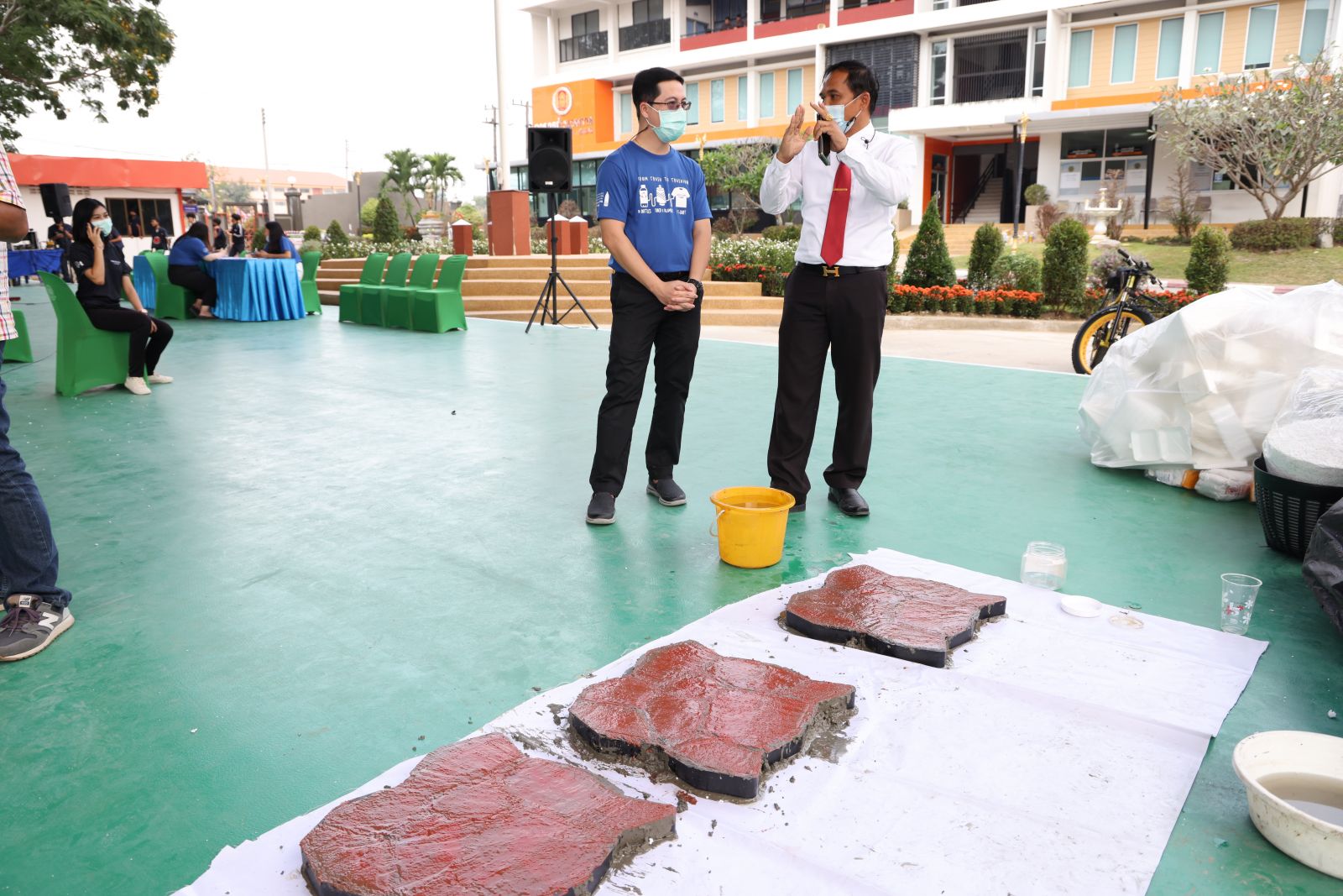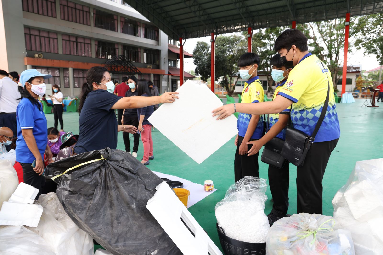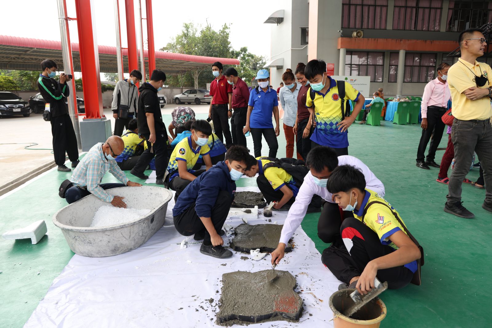 3 มี.ค.64 ที่วิทยาลัยสารพัดช่างระยอง ต.ห้วยโป่ง อ.เมือง จ.ระยอง สำนักงานนิคมอุตสาหกรรมมาบตาพุด และบริษัทพีทีที โกลบอล เคมิคอลจำกัด(มหาชน) บ.จีซีสไตรีนิคส์ จำกัด เทศบาลเมืองมาบตาพุด บ.เอ็นวิคโค จำกัด ธุรกิจ เคมิคอล เอสซีจี ได้ร่วมกันจัดกิจกรรมอบรมให้ความรู้การทำบล็อกปูพื้น ภายใต้โครงการ”จากขยะสู่บล็อกปูพื้น”มีนายกิตติพงค์ อุตตมะเวทิน ผู้อำนวยการวิทยาลัยสารพัดช่างระยอง นายปานโชค เอื้อธนาภา กรรมการผู้จัดการ บ.จีซีสไตรีนิคส์ จำกัด นางนภาพัฒน์ อู่เจริญ ประธานชุมชนและวิสาหกิจชุมชนธนาคารคัดแยกขยะรีไซเคิล ชุมชนวัดชากลูกหญ้า ชาวบ้านในชุมชนวัดชากลูกหญ้า และนักเรียน นักศึกษาจากวิทยาลัยสารพัดช่างระยอง เข้าร่วมโครงการฯ