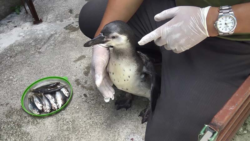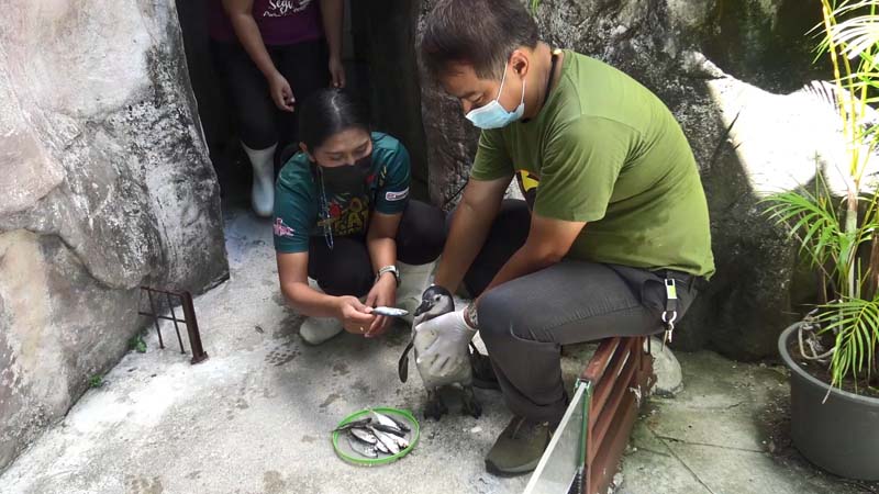 โดยได้เข้ารวมฝูงกับฝูงนกเพนกวินสายพันธุ์ฮัมโบลด์ที่มีอยู่ 13 ตัวของสวนสัตว์สงขลา ทำการฝึกให้เดินพาเหรด ฝึกว่ายน้ำโดยมีนกเพนกวินคอยดูแลและว่ายประกบอยู่ตลอดเวลา โดยจะทำการฝึกทุกวันและจะมีอาหารคือปลาทูแขกให้กินเป็นรางวัล เพื่อที่จะให้ลูกนกเพนกวินเดินพาเหรดบนรางได้คล่องแคล่วขึ้นและสามารถว่ายน้ำได้อย่างรวดเร็วตามสัญชาตญาณของนกเพนกวิน