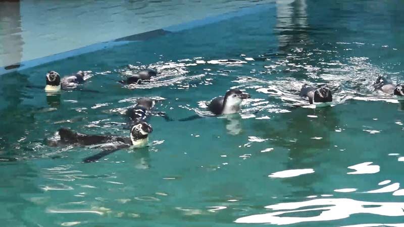 นกเพนกวินฮัมโบลด์ Humboldt Penguin (Spheniscus humboldti ) มีการดัดแปลงอวัยวะที่ใช้ในการบินเพื่อการว่ายน้ำ มีหน้าอกและท้องสีขาว หลังมีสีดำ ส่วนหัวสีดำ มีลายเส้นสีขาวคาดจากฐานปาก ผ่านด้านข้างหัวลงมาถึงคอ อาศัยในเขตร้อนทางหมู่เกาะกูโน และชายฝั่งทะเลของเปรู และชิลี ทวีปอเมริกาใต้ อุณหภูมิที่ต้องการ 22-30 องศาเซลเซียส นกเพนกวินฮัมโบลด์หาอาหารกินในทะเล เช่น ปลา กุ้ง ตัวอ่อนของปู ลูกนกกินอาหารจากการคายออกจากกระเพาะของพ่อแม่นกเพนกวินดื่มน้ำทั้งน้ำจืดและน้ำเค็ม เนื่องจากที่เหนือตามีต่อมขับเกลือ เพื่อขับเกลือส่วนเกินออกได้ นกเพนกวินฮัมโบลด์เป็นสัตว์สังคม อยู่รวมกันเป็นฝูง ส่งเสียงดังเพื่อใช้ในการติดต่อสื่อสาร เวลาทักทายกันจะใช้ปากหรือคอถูกัน ในฤดูผสมพันธุ์นกชนิดนี้จะอยู่กันเป็นฝูงเล็ก ๆ อยู่ตามน้ำหรือขุดโพรงอยู่ตามพุ่มหญ้าสูงในป่าใกล้กับชายฝั่งทะเล วางไข่ ฟักไข่ ปีละ 1 ครั้งในฤดูใบไม้ผลิ สร้างรังด้วยก้อนหิน กิ่งไม้ ใบหญ้า วางไข่ครั้งละ 1 - 3 ฟอง ใช้เวลาฟักไข่ 39 วัน โดยตัวผู้เป็นผู้ฟักไข่ เป็นนกที่บินไม่ได้ เป็นนกเพนกวินขนาดกลาง ความยาวลำตัวประมาณ 65 เซนติเมตร น้ำหนักประมาณ 4 กิโลกรัม