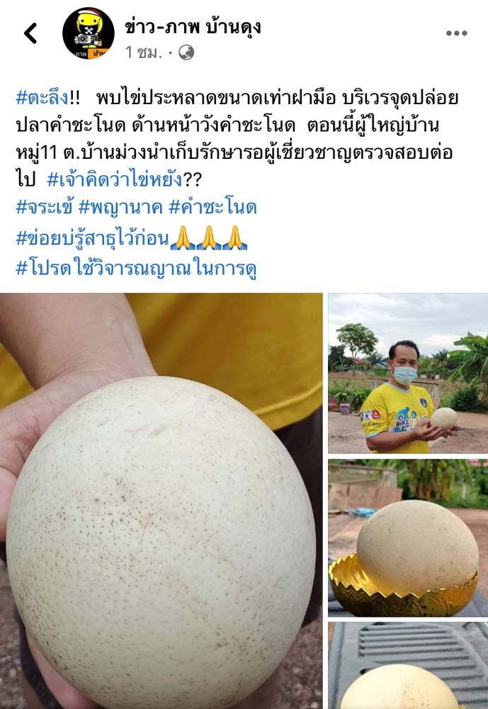 5 พ.ค.64 รายงานข่าวแจ้งว่า เพจเฟซบุ๊กบนโลกโซเชียล จ.อุดรธานี เนื่องยจากพบไข่ประหลาดใหญ่กว่าฝ่ามือที่บริเวณจุดปล่อยปลาคำชะโนด บ้านโนนเมือง อ.บ้านดุง จ.อุดรธานี รอผู้เชี่ยวชาญตรวจสอบ ขณะที่ชาวเน็ตต่างพากันฮือฮาเพราะคิดว่าเป็นไข่พญานาคหรืออาจจะไข่จระเข้ ออกมาวางไข่รอบๆ หนองน้ำคำชะโนดหลังจากไม่มีนักท่องเที่ยวเข้ามากวนที่คำชะโนด โดยไข่ประหลาดดังกล่าวได้เก็บไว้ที่บ้านผู้ใหญ่บ้านบ้านโนนเมือง ต.บ้านม่วง อ.บ้านดุง จ.อุดรธานี