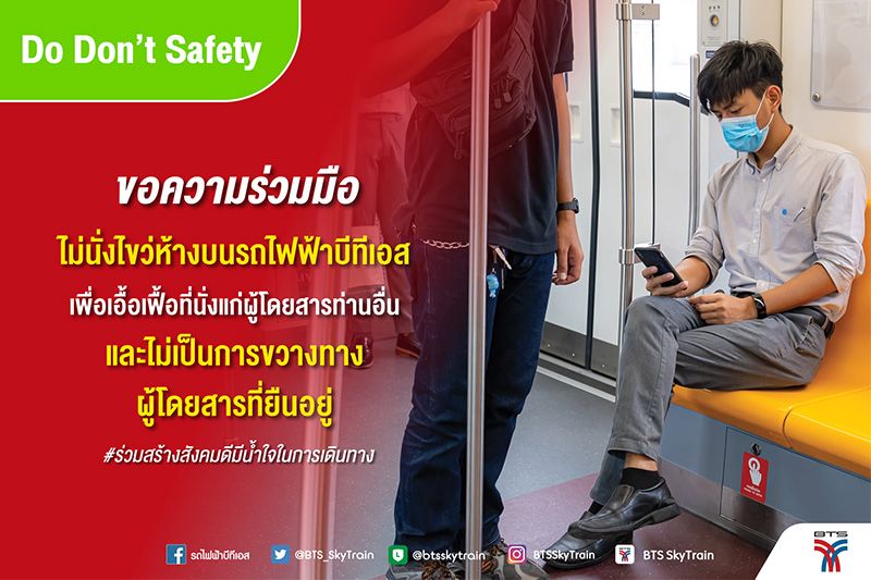 7 ก.ค.64 เฟชบุ๊กแฟนเพจ รถไฟฟ้าบีทีเอส โพสต์ประกาศขอความร่วมมือ ไม่นั่งไขว่ห้างภายในรถไฟฟ้าบีทีเอสนะครับ แอดมินขอความร่วมมือผู้โดยสารที่เดินทางกับรถไฟฟ้าบีทีเอส งดนั่งไขว่ห้างเนื่องจากขาของเราอาจจะไปโดนผู้โดยสารท่านที่ยืนอยู่โดยที่เราไม่รู้ตัวเลยครับ โปรดมีน้ำใจให้แก่กัน เอื้อเฟื้อแบ่งปันที่นั่งให้กับผู้ที่มีความจำเป็นต้องนั่ง คนป่วย คนพิการ เด็ก และสตรีมีครรภ์ นะครับ #ร่วมสร้างสังคมดีมีน้ำใจในการเดินทาง