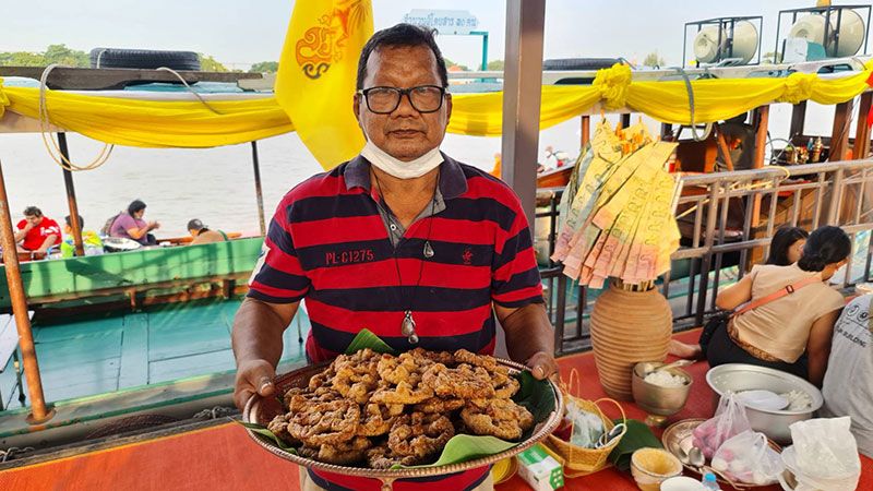 ด้าน นายธีระ ช่างเกตุ อายุ 66 ปี ชาวบ้านตำบลบ้านกลาง กล่าวว่า ตนทำขนมกงมาตัดบาตร ขนมกงจะนิยมใช่ช่วงออกพรรษาอยางเช่นตักบาตรพระร้อย ขนมกง” หรือเรียกอีกชื่อหนึ่งว่า “ขนมกงเกวียน” เป็นขนมไทยโบราณ มีลักษณะเป็นวงกลมและมีเส้นไขว้พาดกันคล้ายรูปล้อเกวียน มีความหมายเป็นสิริมงคล หมายถึงการหมุนไปข้างหน้า หรือการก้าวไปข้างหน้า เช่นเดียวกับพระธรรมจักร จึงนิยมใช้ในพิธีแต่งงาน เพื่อแทนความหมายให้คู่บ่าวสาวครองคู่อยู่ชั่วนิจนิรันดร์. 012