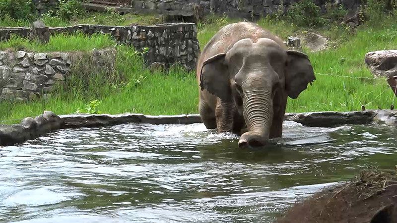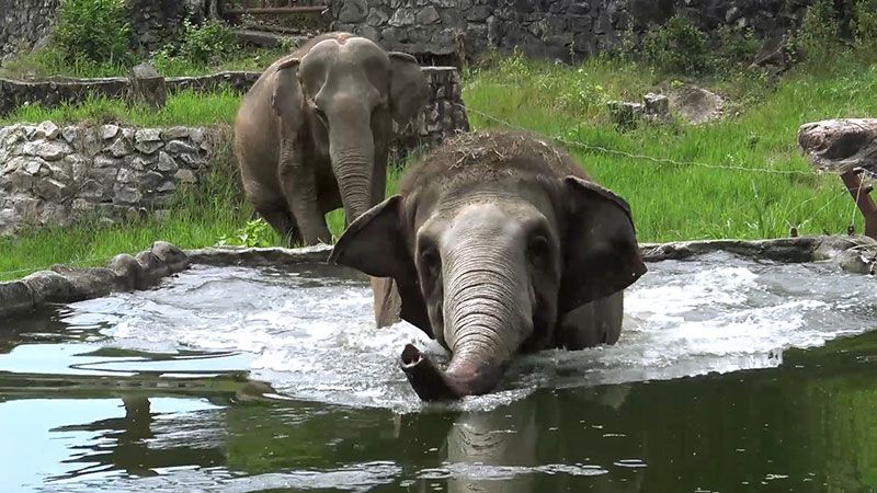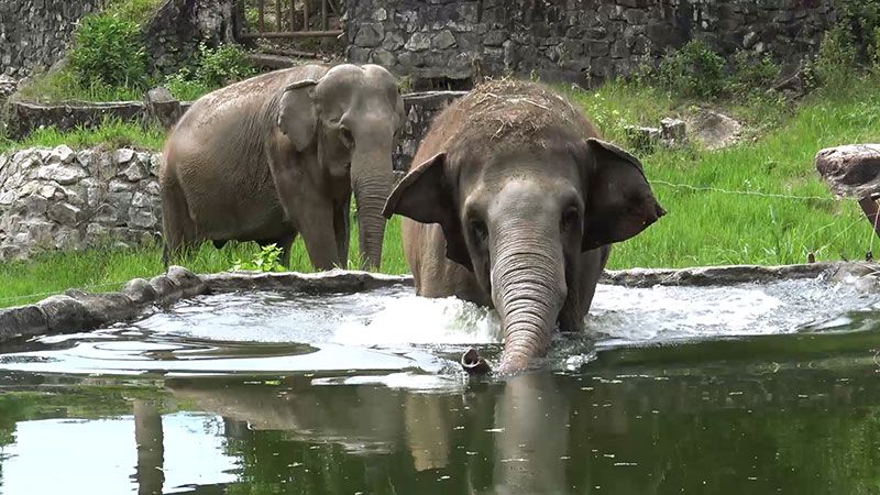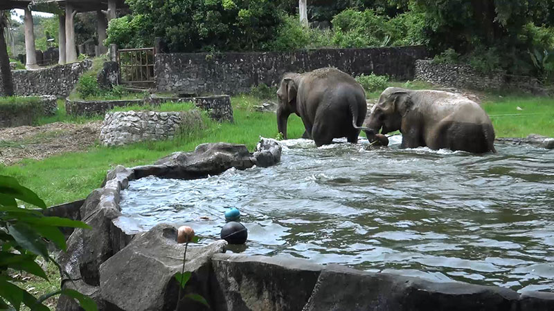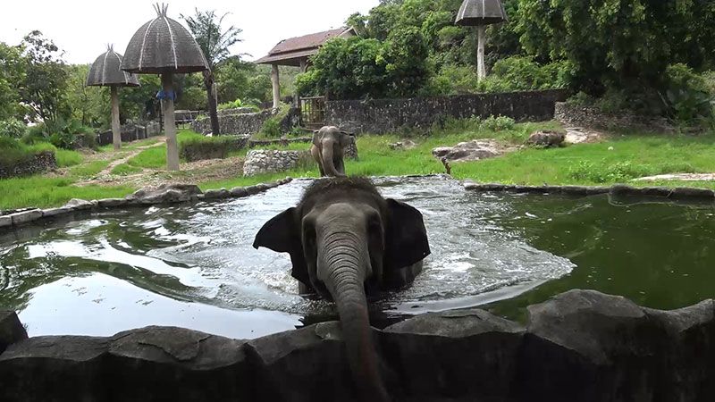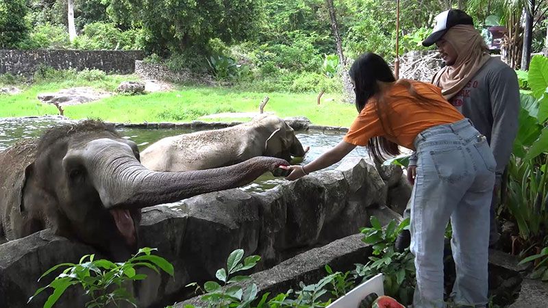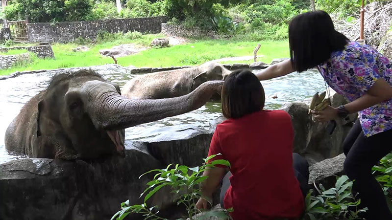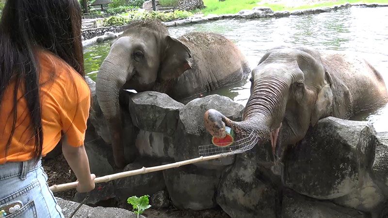 โดยนำช้างป้ามาลีซึ่งถือว่าเป็นช้างผู้สูงอายุวัย 74 ปี พร้อมช้างเจ้าสวยนำลงสระเล่นน้ำสงกรานต์ร่วมกับประชาชนพร้อมให้อาหารช้างทั้งแตงโมและอ้อยในสระน้ำ ในขณะเดียวกันก็จะให้ช้างเจ้าสวยโชว์ลีลาการเล่นของเล่นในสระน้ำให้ประชาชนได้ชมด้วยพร้อมให้ประชาชนให้อาหารช้างทั้ง 2 เชือกทั้งแตงโมและอ้อยซึ่งเป็นอาหารโปรดของช้าง และก่อนจะให้อาหารกับช้างเจ้าสวย ก็จะให้เจ้าสวยแสดงความขอบคุณทุกครั้ง เพื่อแสดงให้เห็นว่า ช้างก็มีจิตสำนึกในการขอบคุณผู้ให้อาหารกินทุกคนได้เช่นเดียวกับมนุษย์