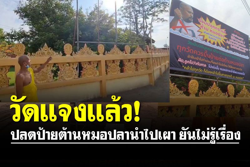 วัดแจงแล้ว! ปลดป้ายต้านหมอปลานำไปเผา ยันไม่รู้เรื่อง ชาวบ้านเผยมีพระมายืนคุมนำป้ายมาติด