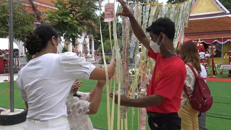 พุทธศาสนิกชนชาวสงขลา แห่ทอดผ้าป่าลอยฟ้าเพื่อสมทบทุนสร้างท้าวเวสสุวรรณองค์จริง ความสูง 10.9 เมตร สูงที่สุดในชายแดนภาคใต้