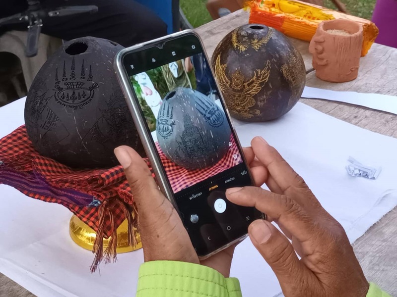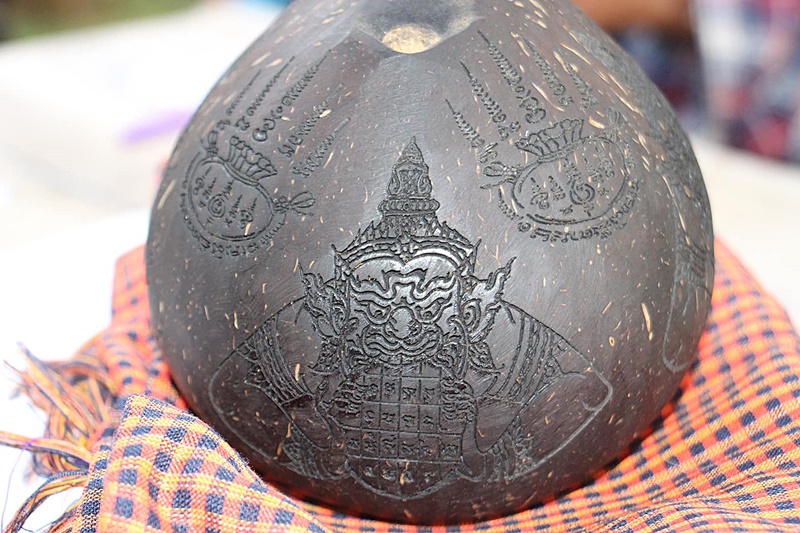 กะลาลูกนี้ยังมีความพิเศษคือเป็นกะลาที่ตกน้ำมัน สังเกตที่บริเวณรูปราหูจะมีลักษณะมันวาว มีการแกะสลักยันต์ขวัญถุงไว้ทั้ง 2 ข้างของราหูอมจันทร์ นำมาวางอยู่บนพาน รองด้วยผ้าสี จากคำเล่าลือว่าเมื่องวดที่ผ่านมาเจ้าของบ้านหลังนี้เคยเขียนเลขบนกระดาษม้นใส่กะลาไว้แล้วขอโชค ขอลาภ ได้เลข 20 แต่ไม่ได้เสี่ยงโชค คิดว่าเลขนี้คงไม่ออก แต่ปรากฏว่า รางวัลเลขท้าย 2 ตัว ออก 02 ทำให้รู้สึกเสียดาย จึงไปเล่าบอกต่อให้เพื่อนบ้านที่เป็นคอหวยฟังกัน ทำให้วันนี้หลายคนใช้เวลาว่างเดินทางมาทำพิธีขอหวังได้เลขเด็ด เผื่อจะมีโชค