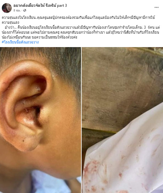 โดยข้อความระบุว่า "ความรุนแรงในโรงเรียน..คุณครูและผู้ปกครองต้องรวมกันเพื่อแก้ไขดูแลป้องกันไม่ให้เด็กๆ มีปัญหามีการใช้ความรุนแรง