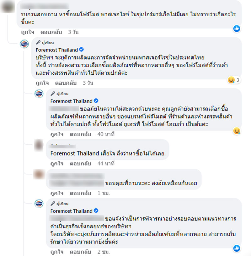 ขณะที่แอดมินเพจ Foremost Thailand ได้เข้ามาตอบข้อสงสัยดังกล่าวแล้ว ซึ่งก็ทำให้หลายคนอดใจหายไม่ได้ " บริษัทฯ จะยุติการผลิตและการจัดจำหน่ายนมพาสเจอร์ไรซ์ในประเทศไทย