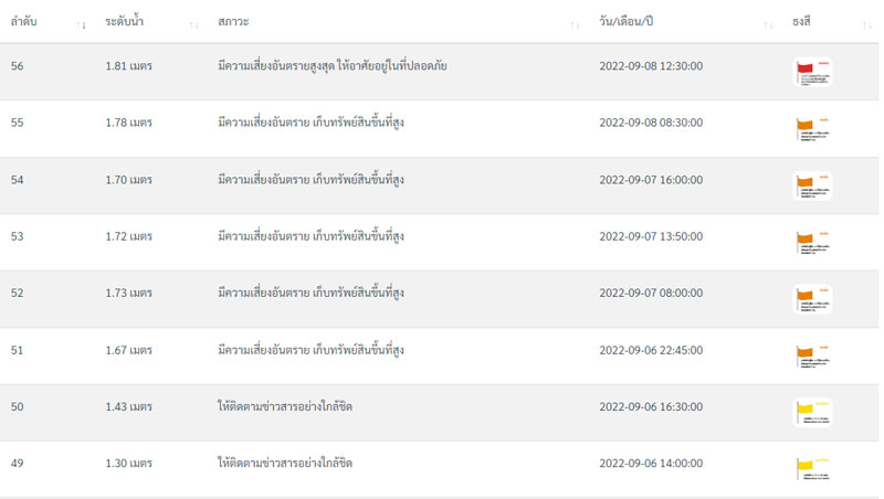 8 ก.ย.5 รายงานข่าวแจ้งว่า เว็บไซต์ของเทศบาลนครรังสิต ได้รายงานอัปเดตสถานการณ์ระดับน้ำในพื้นที่เทศบาลนครรังสิต จ.ปทุมธานี พบว่าเมื่อเวลา 12.30 น. ของวันนี้ (8 ก.ย. 65) ระดับน้ำอยู่ในระดับ 1.81 เมตร พร้อมมีการธงสีแดง ประกาศเตือนระดับน้ำอยู่ในเกณฑ์ที่มีความเสี่ยงอันตรายสูงสุด ให้อาศัยอยู่ในสถานที่ปลอดภัย และปฏิบัติตามข้อสั่งการ .-008