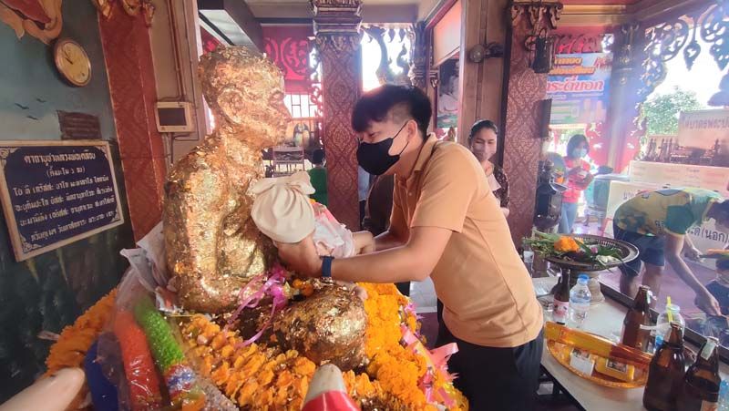 ช่วงวันหยุดยาว! วิหารหลวงพ่อเคลือบ แคบทันตา เนืองแน่นด้วยประชาชนกราบไหว้พร้อมกระซิบข้างหู ขอโชคลาภ โดยมีสามีภรรยาอุ้มลูกน้อย มาแก้บนหลังขอลูกด้วยระบบไอยูไอจากหลวงพ่อได้ทันตาเห็น - เขย่าไม้ติ้วขอเลขเด็ด