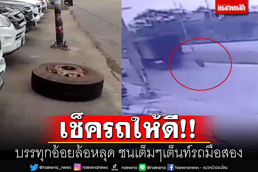 วงจรปิดจับภาพวินาทีรถพ่วง 18 บรรทุกอ้อย ล้อหลุดกลิ้งชนเต็นท์รถมือสองพังเสียหายไป 1 คัน เจ้าของร้านฝากเป็นอุทาหรณ์ รถใหญ่อย่าบรรทุกหนัก เช็คสภาพรถด้วย