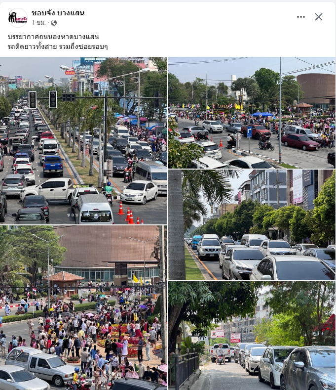 ล่าสุด เพจเฟซบุ๊ก ชอบจัง บางแสน ได้โพสต์ภาพบรรยากาศที่นักท่องเที่ยวทะลักเข้าบางแสนบอกได้คำเดียวว่าเต็มคาราเบลมาก บางแสนกลับมาคึกคักมาก โดยระบุข้อความว่า "บรรยากาศถนนลงหาดบางแสน รถติดยาวทั้งสาย รวมถึงซอยรอบๆ".-008