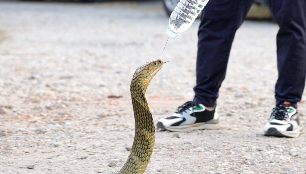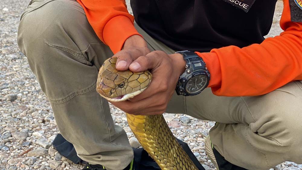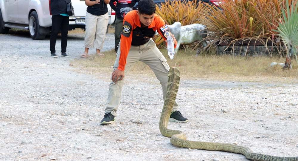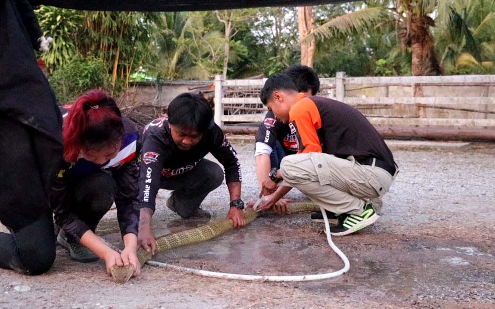 โดยในวันนี้ทีมพิทักษ์อสรพิษระยอง นำโดยนายสุริยันต์ ประทุม อายุ 28 ปี ครูฝึก (เสื้อส้ม) และทีมงาน ได้นำงูจงอางสีทอง ตัวที่จับได้จากบ้านเรือนของประชาชน ขนาดความยาวเกือบ 4 เมตร เพศผู้ น้ำหนักงู ประมาณ 14 กิโลกรัม ปล่อยออกมาเพื่อตรวจดูความแข็งแรง พบว่างูไม่มีอาการเจ็บป่วย จึงได้ทำการอาบน้ำ เพื่อล้างกลิ่นตัว และกลิ่นปัสสาวะอุจจาระออก และให้น้ำงูเพื่อให้ผ่อนคลายความเครียด หลังจากนั้นต้องเช็ดตัวให้แห้งป้องกันไม่ให้เกิดโรคผิวหนังแล้วนำเข้ากล่องพลาสติกเพื่อให้งูพักผ่อน