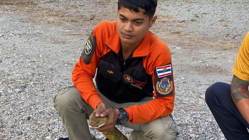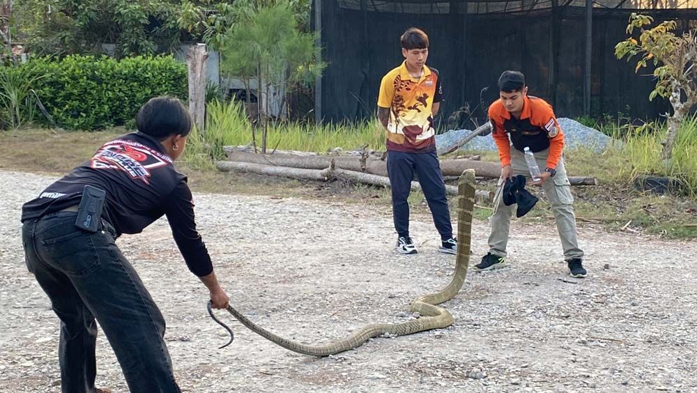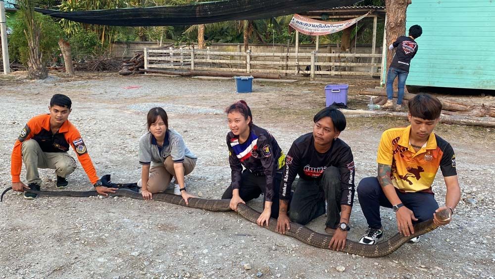 28 มี.ค.66 จากกรณีทีมพิทักษ์อสรพิษระยอง ได้รับแจ้งเหตุจาก นางพุทธชาติ สำราญสุข อายุ 49 ปี ผู้ใหญ่บ้านเขาลอย ว่าพบงูตัวใหญ่ไม่ทราบชนิดเข้าบ้าน เลขที่ 266/1 ม.5 ต.ชากบก (ชาก-กะ-บก) อ.บ้านค่าย จ.ระยอง จึงรวบรวมทีมงานจิตอาสา พร้อมอุปกรณ์ เดินทางไปยังที่เกิดเหตุ เมื่อถึงที่เกิดเหตุ พบเป็นบ้านปูน ชั้นเดียว 2 หลังติดกัน รอบบ้านเป็นป่ายางและป่าหญ้า มีความชื้นมีนายทองใส กำจร อายุ 61 ปี เป็นเจ้าของบ้าน ได้พาเข้าไปตรงจุด ที่งูซุกซ่อนอยู่ ทีมจิตอาสาเข้าตรวจสอบพบว่าเป็นงูจงอาง ขนาดใหญ่ ตัวสีทอง นอนขดอยู่ข้างถังแก๊สในห้องครัว สายตาจ้องเจ้าหน้าที่ อย่างดุร้าย พร้อมที่จะฉกตลอดเวลา หลังจากนั้นเจ้าหน้าที่ นำน้ำใส่ขวด มาฉีดใส่ที่หัวงู เพื่อทำให้งูนั้นคลายพฤติกรรมดุร้ายลง ใช้เวลาในการปลุกปล้ำกว่า 3 ชั่วโมง จึงสยบเจ้างูจงอางสีทองขนาดใหญ่ได้พบว่ามีความยาว 4 เมตร