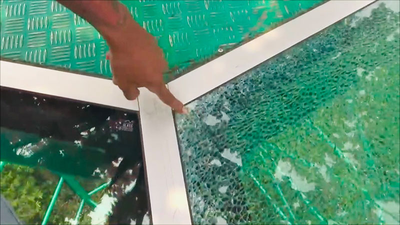 ส่วนแผ่นกระจกที่เกิดรอยแตกเจ้าหน้าที่ยืนยันว่าเ ป็นกระจกแยกส่วน ดังนั้นหากแผ่นหนึ่งแตกแผ่นอื่นก็ไม่เสียหาย รวมทั้งแผ่นที่แตกก็จะไม่หล่นลงไปหรือแม้แต่มีเศษตกลงไปสู่พื้นล่าง เพราะออกแบบให้เหนียวและยืดติดกันแน่ โดยได้ทดลองให้คน 4-5 คน ยืนอยู่ด้านบนเพื่อพิสูจน์ความปลอดภัยด้วย
