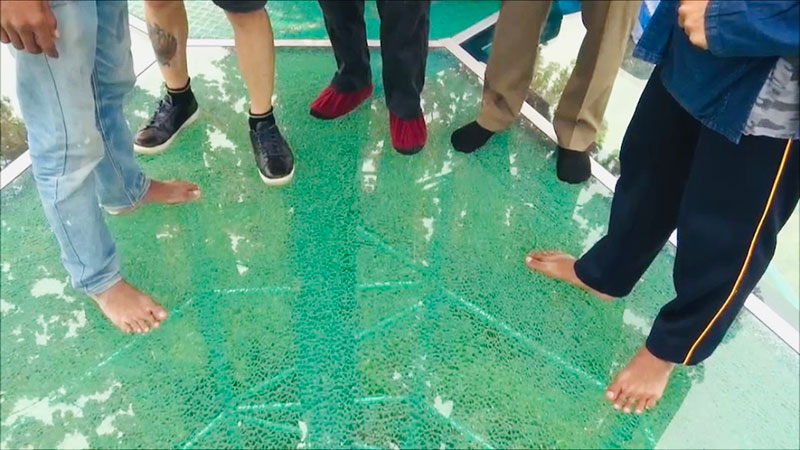 ออกแบบให้สามารถรองรับแผ่นดินไหวได้ ส่วนกระจกเป็นแผ่นซ้อนกัน 3 ชั้น มีความหนากว่า 48 มิลลิเมตร ก่อนการเปิดได้มีการทดลองด้วยกระสอบขนาด 50 กิโลกรัมจำนวน 58 ใบ น้ำหนักประมาณ 2,900 กิโลกรัม วางทับซึ่งพบว่ามีความแข็งแรง ดังนั้นหลังพิธีเปิดทางวัดได้ให้นักท่องเที่ยวเข้าชมตั้งแต่เวลา 07.30-18.00 น. โดยให้ผู้เดินเข้าไปสวมใส่ถุงเท้าเพื่อรักษาสภาพกระจกด้วย.012