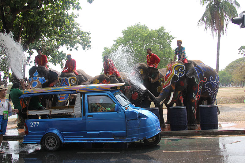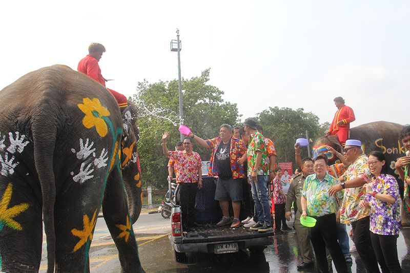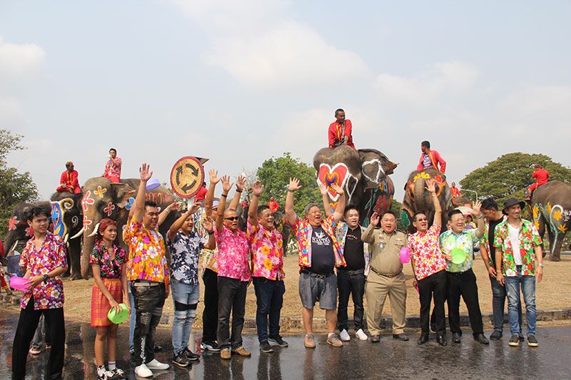 โดยช้างจากวังช้างอยุธยา แลเพนียด จำนวน 10 เชือก ถูกจับมาแต่งแต้มสีสันวาดลายดอกโสน ซึ่งเป็นดอกไม้ประจำจังหวัด อย่างสวยงาม และพามาเล่นน้ำกับนักท่องเที่ยว