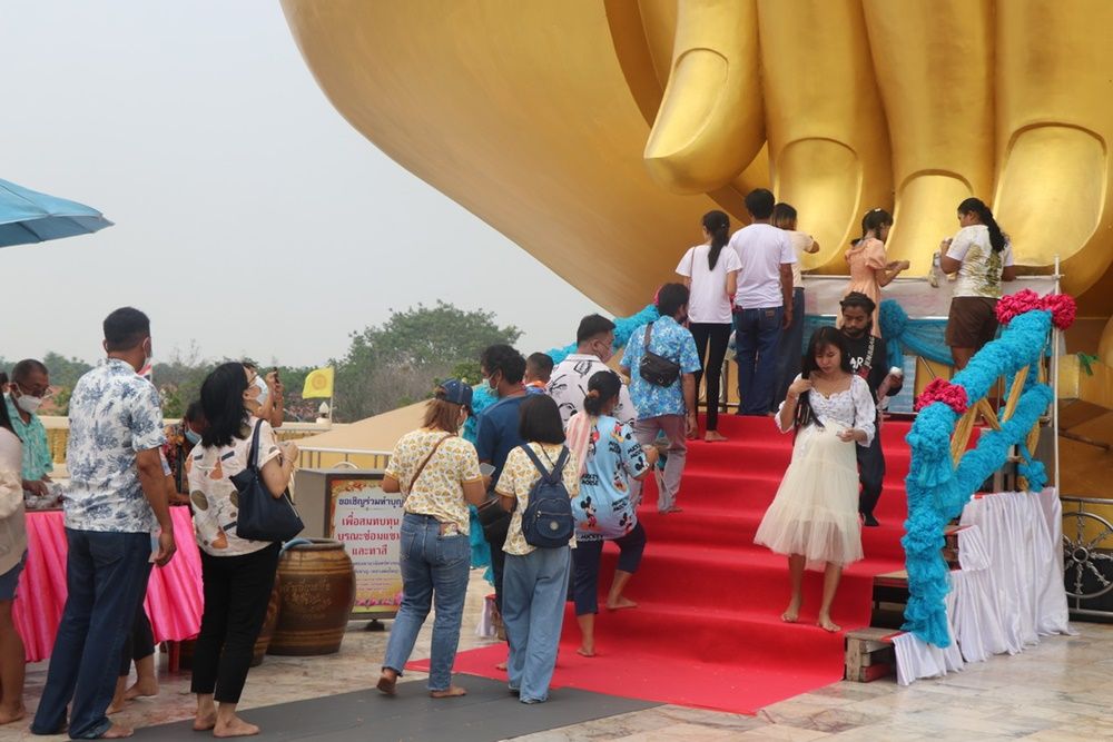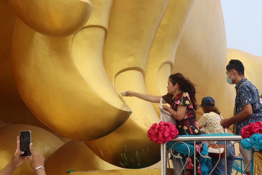 วันที่ 14 เม.ย.66 ที่วัดม่วง ตำบลหัวตะพาน อำเภอวิเศษชัยชาญ จังหวัดอ่างทอง ได้มีประชาชนและนักท่องเที่ยวจำนวนมากเดินทางไปสรงน้ำ 'ปลายนิ้วหลวงพ่อใหญ่" พร้อมกับขอพรเสริมสิริมงคลเนื่องในวันสงกรานต์หรือวันขึ้นปีใหม่ไทยกันคึกคัก โดยใช้มือสัมผัสที่ปลายนิ้วของหลวงพ่อใหญ่ พระพุทธมหานวมินทร์ศากยมุนีศรีวิเศษชัยชาญ โดยมีตำนานเล่าขานต่อกันมาว่า ถ้าใครได้มาเคารพสักการะและขอพรใช้มือสัมผัสที่ปลายนิ้วของหลวงพ่อและอธิษฐานจะสมหวังในเรื่องหน้าที่การงานเจริญรุ่งเรือง ซึ่งมีประชาชนต่อแถวไหว้พระสรงน้ำที่ปลายนิ้วขอพรกันอย่างต่อเนื่อง