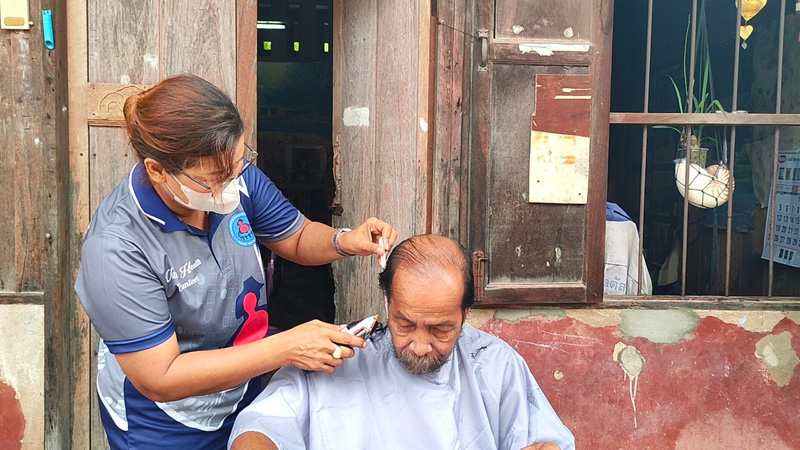 โอกาสนี้ ประไพและบุตรสาว ได้เดินทางต่อไปยังบ้านผู้ป่วยติดเตียงหลังที่ 2 เป็นหญิงสูงวัย อายุ 62 ปี เพื่อตัดผมให้ ตามความต้องการของผู้ป่วย โดยทรงผมที่ผู้ป่วยเลือก มีทั้ง รองทรงสูงในผู้ชาย ซอย ทรงผมบ๊อบ ทรงสวอกกี้ในผู้หญิง