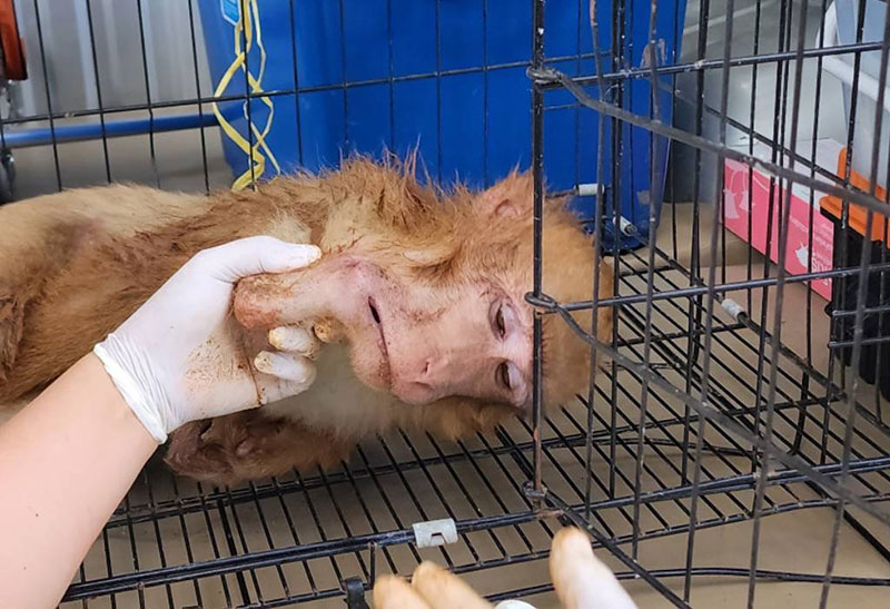 จึงได้ส่งเจ้าหน้าที่ตรวจสอบ พบว่าลิงตัวดังกล่าวอยู่บนต้นไม้สูง โดยมีลักษณะผิดปกติบริเวณใต้คาง เกิดการอักเสบ บวม แดง จึงวางแผนไล่ต้อนยิงยาสลบจนสำเร็จ จากนั้นรีบตรวจร่างกายพบกล่องลูกอมพลาสติกขนาดประมาณ 4 - 5 เซนติเมตร เบียดอยู่ใต้กราม และกระพุ้งแก้ม ทำให้เกิดการอักเสบติดเชื้อภายในช่องปาก จึงได้นำขวดพลาสติกออก แล้วฉีดยาฆ่าเชื้อ ยาลดอักเสบ วิตามิน ให้น้ำเกลือ และทำการล้างแผล