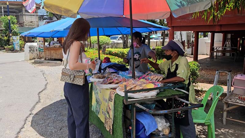 นางฝน กล่าวต่อไปว่า มีอยู่วันหนึ่งคุณยายเป็นลมหน้าฟาดกับพื้นได้รับบาดเจ็บ เป็นช่วงจังหวะที่ “เอิร์ธสดชื่น” เดินทางมาพบเห็นพอดีรู้สึกสงสารคุณยายได้เหมาสินค้าที่มีอยู่ทั้งหมด จากนั้นเมื่อคุณยายมานั่งขายของที่วัดใหญ่สุวรรณาราม ตนจะคอยดูแลหายาและหาข้าวให้ทานอยู่เป็นประจำ ปัจจุบันมีแม่ค้าขายของตลาดนัดรู้สึกสงสารจึงได้รับคุณยายจันทร์ไปพักอาศัยอยู่ที่บ้านด้วย หากใครผ่านเข้ามาเที่ยวชมวัดใหญ่สุวรรณารามวรวิหาร ขอเชิญเข่ามาช่วยอุดหนุนสินค้าของคุณยายจันทร์ด้วย เพื่อที่คุณยายจันทร์จะได้มีรายได้ไปต่อทุนและเลี้ยงชีพตัวเองในบั้นปลายชีวิต.-008