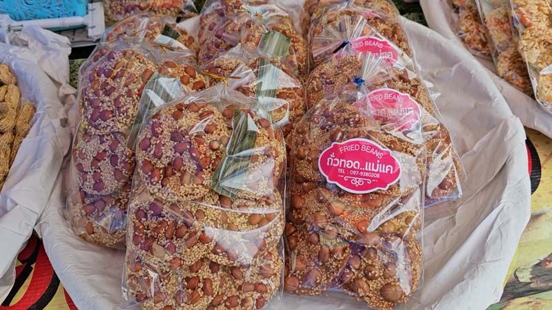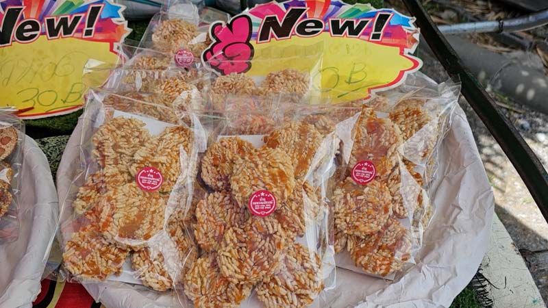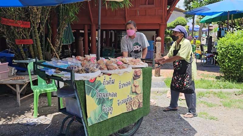 นางฝน จันทร์นวล กล่าวเสริมว่า เมื่อ 3-4 ปีที่ผ่านมา เมืองเพชรบุรีเกิดน้ำท่วมอย่างหนักส่งผลทำให้น้ำไหลหลากเข้าบ้านเช่าของคุณยายจันทร์จนไม่สามารถอยู่อาศัยได้ คุณยายจันทร์ต้องเร่ร่อนไปอาศัยนอนตามสถานที่ต่างๆ ครั้งหนึ่งมีผู้พบเห็นคุณยายนอนป่วยไม่สบายอยู่ที่หน้าร้านเซเว่น-อีเลฟเว่นจึงนำส่งไปรักษาที่โรงพยาบาล เมื่อหายแล้วได้ส่งตัวคุณยายจันทร์กลับบ้านเกิดที่ จ.ราชบุรี แต่คุณยายอยู่ไม่ได้จึงหนีกลับมาอยู่ที่เมืองเพชรบุรีอีกครั้ง และได้รับขนมข้าวแต๋น, ถั่วแผ่นทอด และถั่วต้ม มาใส่รถเข็นรุนไปนั่งขายที่วัดใหญ่สุวรรณาราม และเร่ขายที่ตลาดนัดเปิดท้ายวัดพระพุทธไสยาสน์ หรือวัดพระนอน ตลาดตลาดนัดพรีเมียร์มาร์เก็ต ถนนคนเดินพานิชเจริญ ได้กำไรชิ้นละ 5-10 บาท